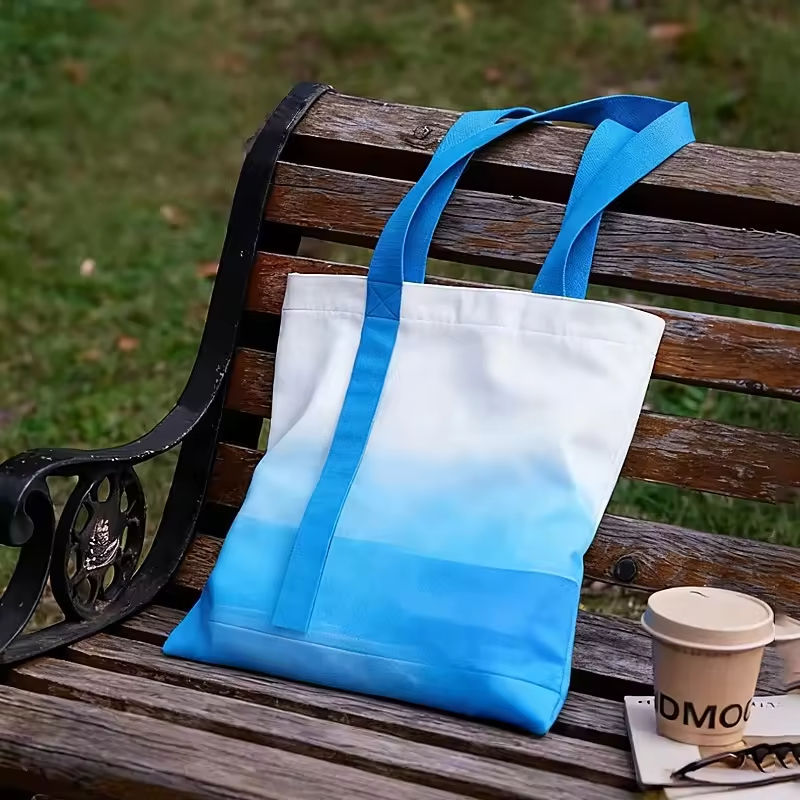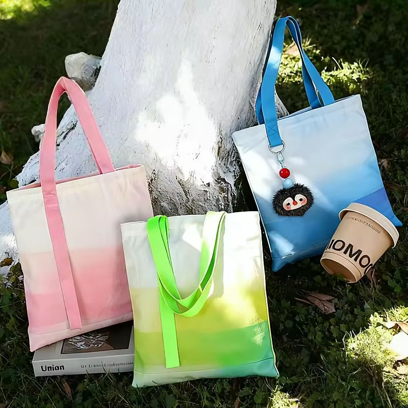 กระเป๋าผ้าแคนวาสไล่เฉดสีพร้อมโลโก้แบบกำหนดเอง สายริบบิ้นห้อยตกแต่ง ดีไซน์ทันสมัย ให้ความรู้สึกพรีเมียม ใช้ซ้ำได้ พับเก็บได้ ความจุเยอะ ใช้ถือได้ เหมาะสำหรับเป็นของขวัญ