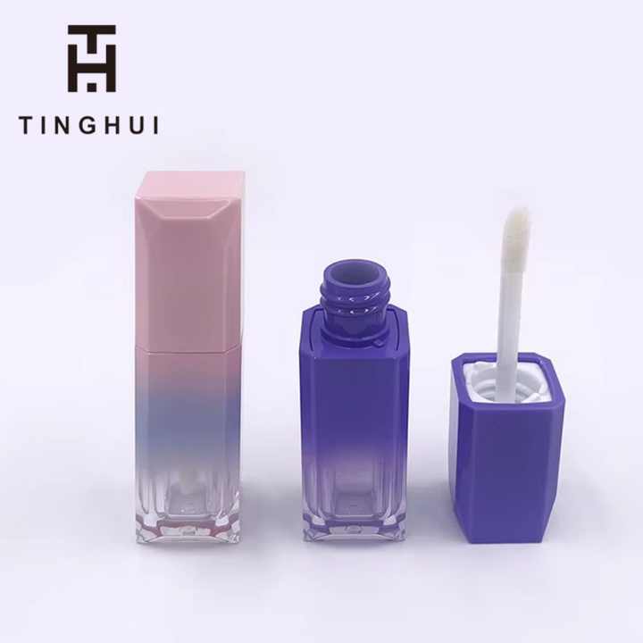 หลอดลิปกลอสสีไล่เฉดแบบสี่เหลี่ยม ขนาด 5 มล. บรรจุภัณฑ์เครื่องสำอางพลาสติกพร้อมฝาเกลียว ขวดลิปสติกแบบหลอด