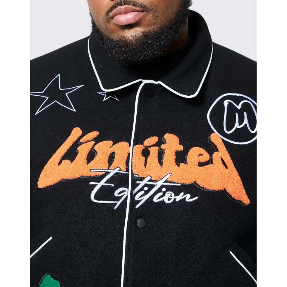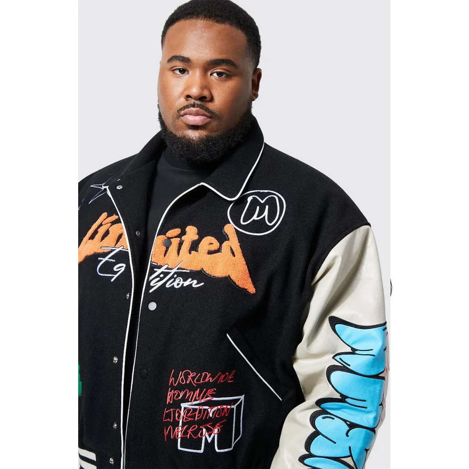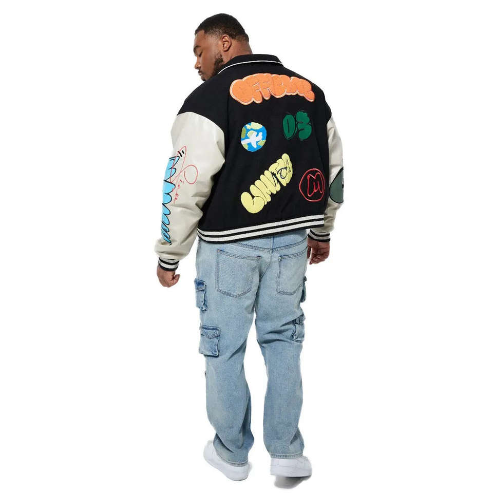 เสื้อแจ็คเก็ตเบสบอลวาร์ซิตี้แขนหนังขนสัตว์ฟอกย้อมลายกราฟฟิตีสำหรับผู้ชาย สไตล์ไฮสตรีท ปกคอพับ กันลม
