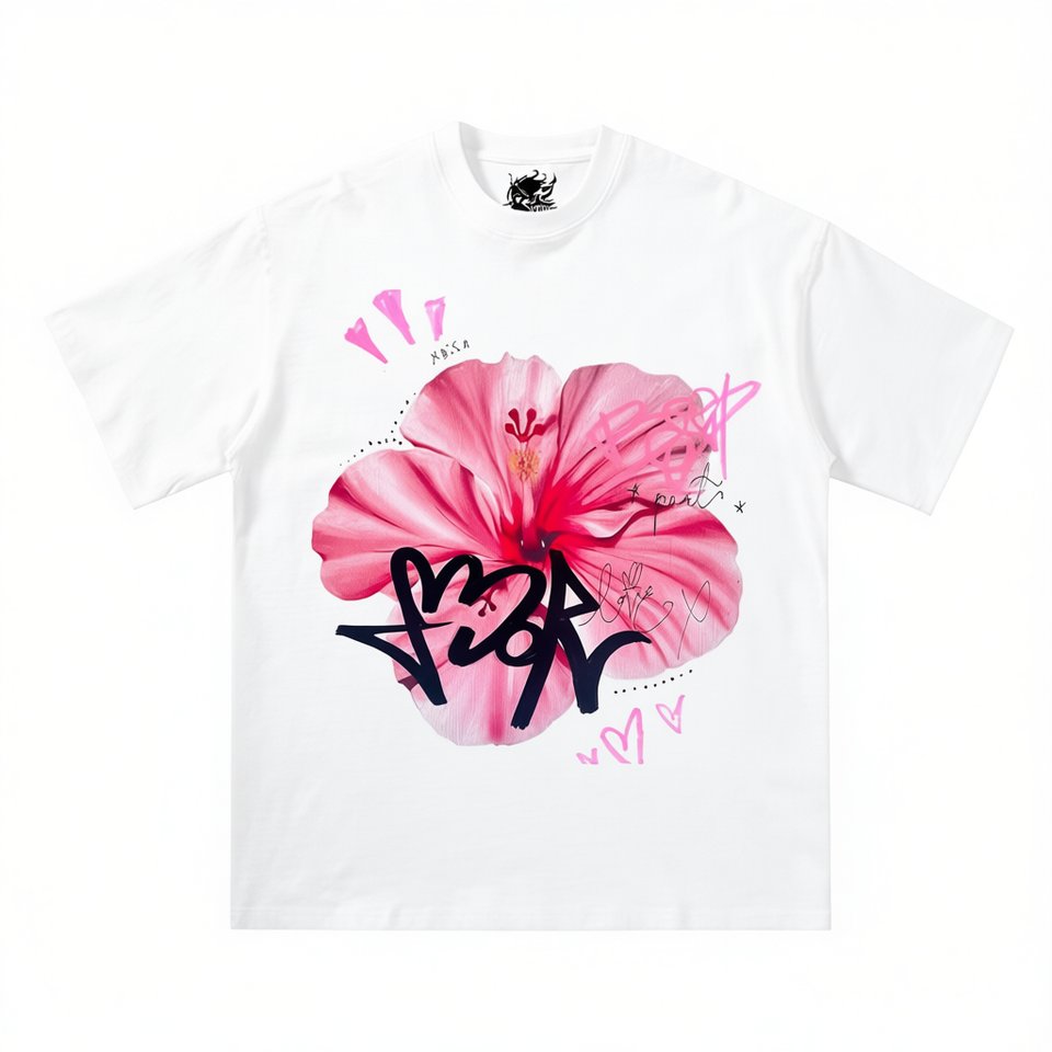เสื้อยืดเด็กทรงบ็อกซี่ลายกราฟฟิตี้ดอกชบา แขนสั้น โอเวอร์ไซส์ สไตล์สตรีทแวร์ สำหรับฤดูใบไม้ผลิและฤดูร้อน ผ้าคอตตอนเจอร์ซีย์ 100% คอกลม
