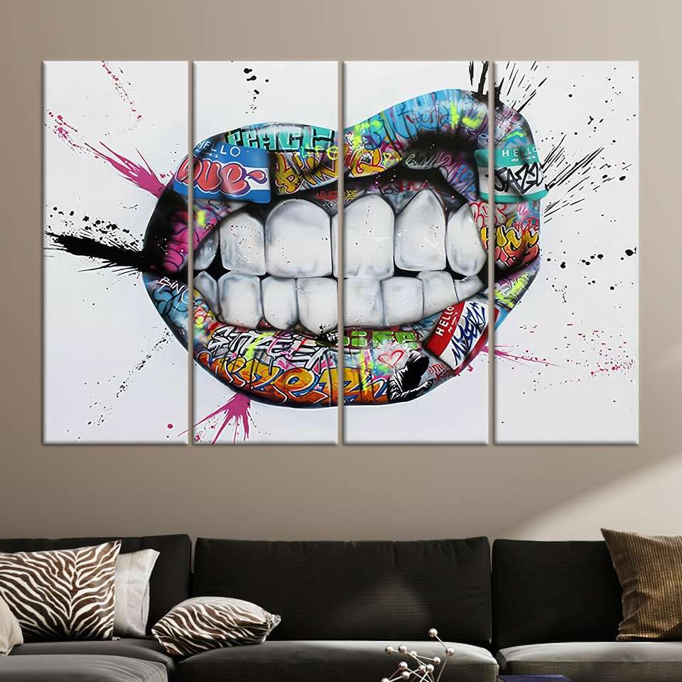 ภาพพิมพ์บนผ้าใบลายกราฟฟิตี้ลิปส์: ของตกแต่งสไตล์ป๊อปอาร์ตสีสันสดใสในเมือง ชุดผ้าใบ 4 ชิ้น