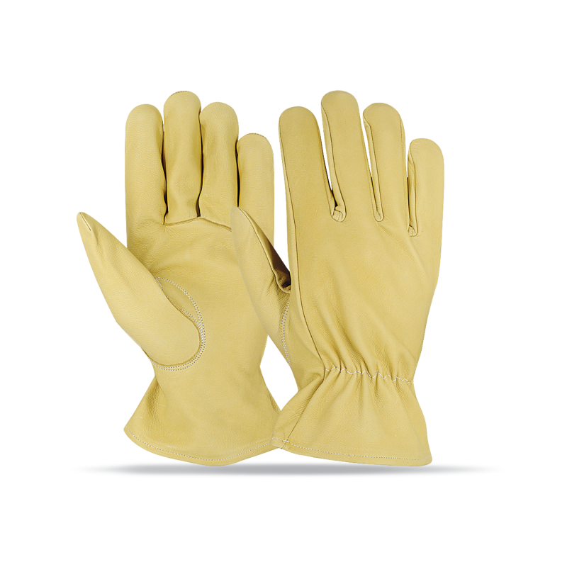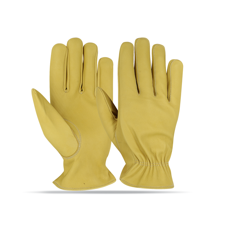 ถุงมือหนังวัวแท้ 10 นิ้ว สำหรับขับรถ คนงาน ทำสวน ป้องกันนิ้วโป้ง หนังแพะลายเม็ดข้าว สีขาวเหลือง