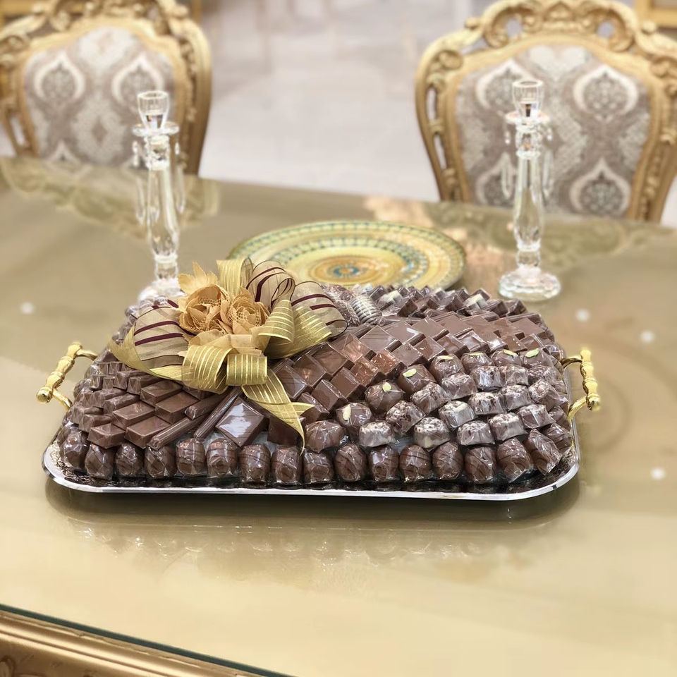 ถาดเสิร์ฟช็อกโกแลตทรงสี่เหลี่ยมหรูหราพร้อมริบบิ้นสีทองตกแต่ง สำหรับงานแต่งงานหรืองานหมั้นระดับพรีเมียม