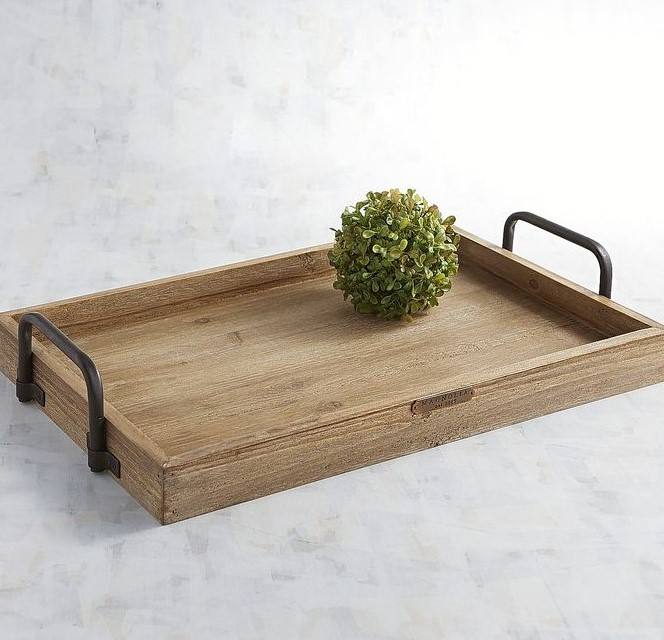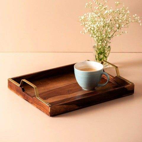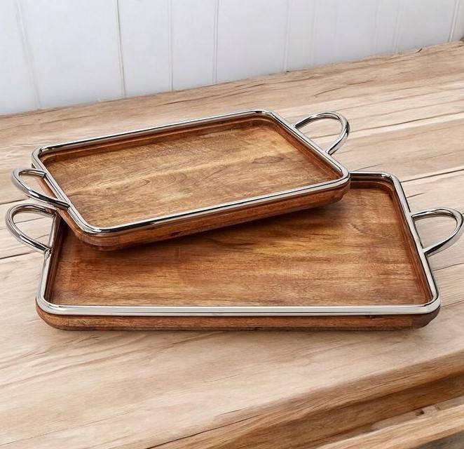 ถาดเสิร์ฟไม้มะม่วงแกรนด์และเหล็กตกแต่งมีสองขนาดสามารถอธิบายได้ว่าเป็นชุดถาดสี่เหลี่ยมสองใบ