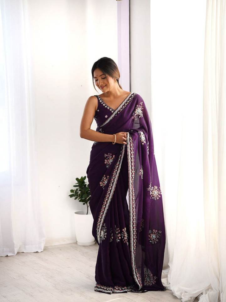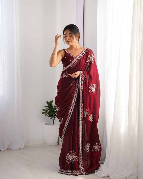 ผ้าส่าหรีผ้าไหมในกำมะหยี่ประกายประกายประกายด้วยลูกปัดทองคำแท้และงานฝีมืออันปราณีต