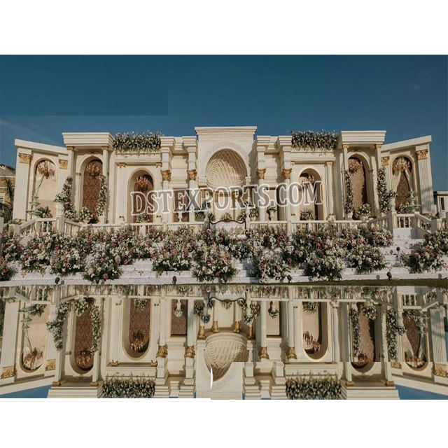 แกรนด์ราชมฮาล์ธีมเวทีสําหรับงานแต่งงานกลางแจ้งชายหาดกลางแจ้งด้านข้างงานแต่งงานโรมันชุดเวทีไขมันใหญ่ฮินดูงานแต่งงานการตั้งค่าเวที