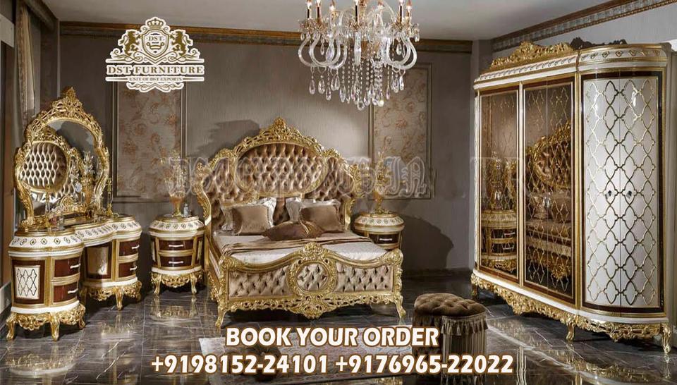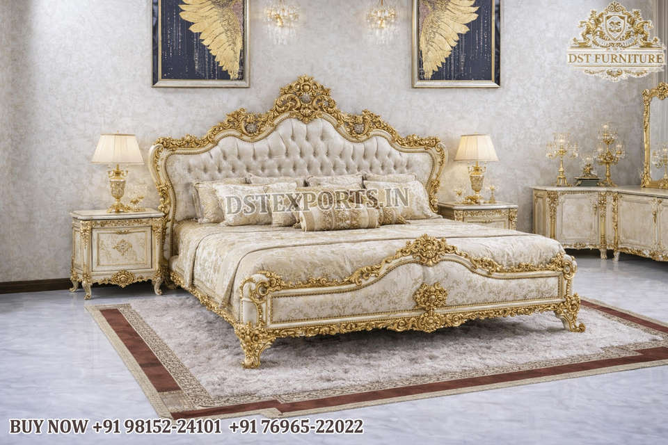 ชุดห้องนอนแกะสลักสไตล์วิคตอเรียนสุดหรู ซื้อชุดเฟอร์นิเจอร์ห้องนอนใหญ่ทำจากไม้สักอย่างดี รุ่นเฮอริเทจ โกลด์ ฟินิช ชุดเตียงแคลิฟอร์เนีย