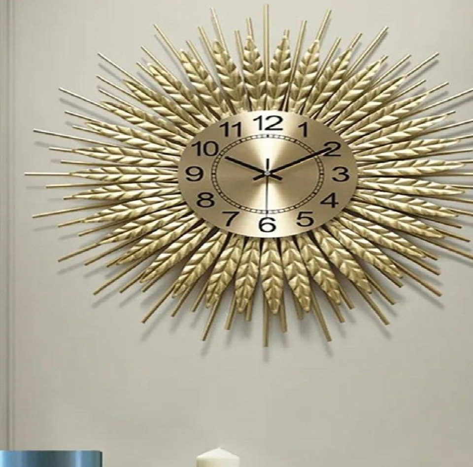นาฬิกาโลหะสีทองลายรัศมีดวงอาทิตย์ พร้อมลายรัศมีซ้อนกันที่ได้แรงบันดาลใจจากใบไม้ ชิ้นงานตกแต่งสุดหรูหราพร้อมจำหน่ายในราคาขายส่ง