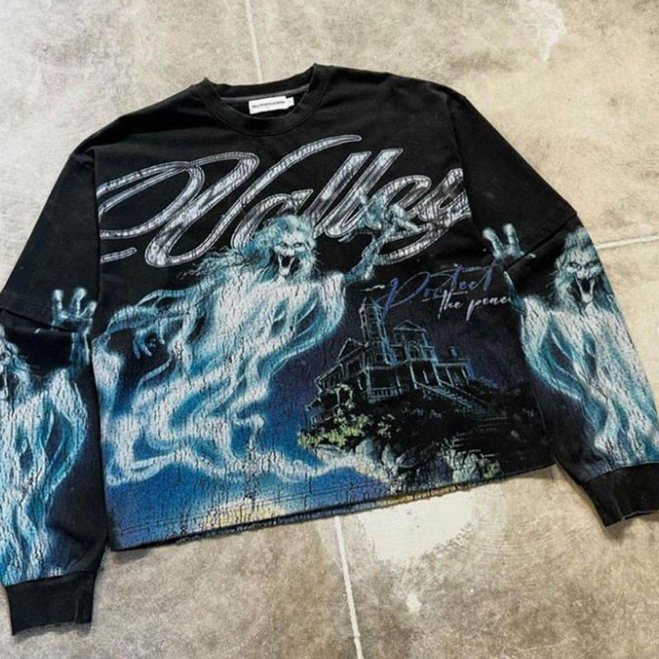 เสื้อยืดพิมพ์ลายกราฟิกแขนสองชั้นแบบสวมใส่สบาย แห้งเร็ว ทรงหลวม แฟชั่นทันสมัยสำหรับผู้ชาย