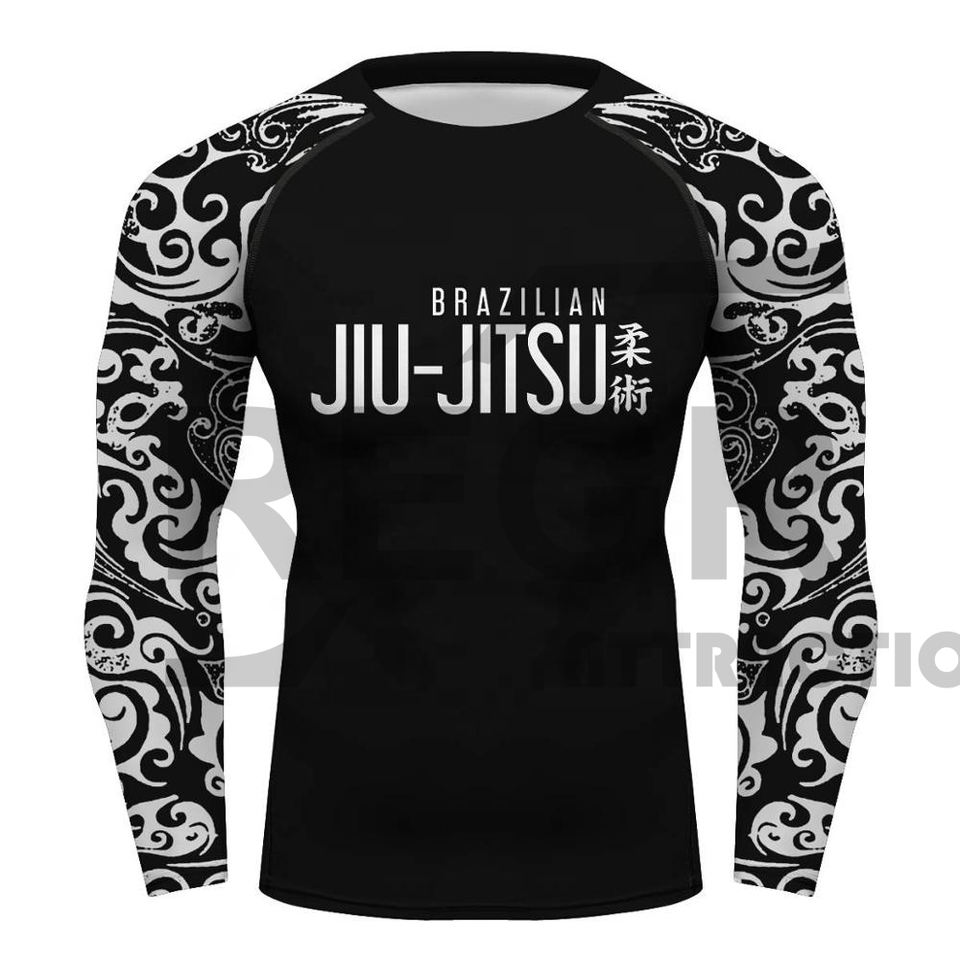 เสื้อรัดกล้ามเนื้อสำหรับกีฬา MMA แบบ Grappling ออกแบบเองได้ด้วยเทคนิค Sublimation เสื้อ Bjj Rashguard พิมพ์ลายตามสั่งสำหรับผู้ชาย เทคโนโลยี OEM แขนยาว