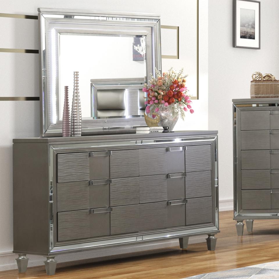 ชุดเฟอร์นิเจอร์ห้องนอนสีเทาพร้อมหัวเตียงแบบมีกระดุม ตกแต่งด้วยกระจก และตู้ข้างเตียง ตู้ลิ้นชัก และตู้เก็บของเข้าชุด