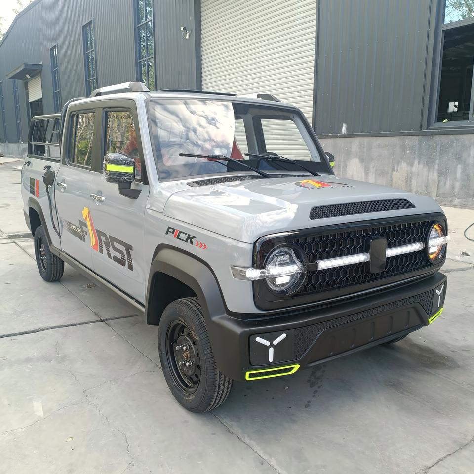 รถกระบะไฟฟ้าสีเทาขนาดใหญ่ ขับเคลื่อนสี่ล้อ แบตเตอรี่ลิเธียม 30 กิโลวัตต์ชั่วโมง ระยะทางวิ่ง <100 กม. มอเตอร์ 7500 วัตต์ กำลังไฟฟ้า 3500 วัตต์ สำหรับครอบครัวและขนส่งสินค้า