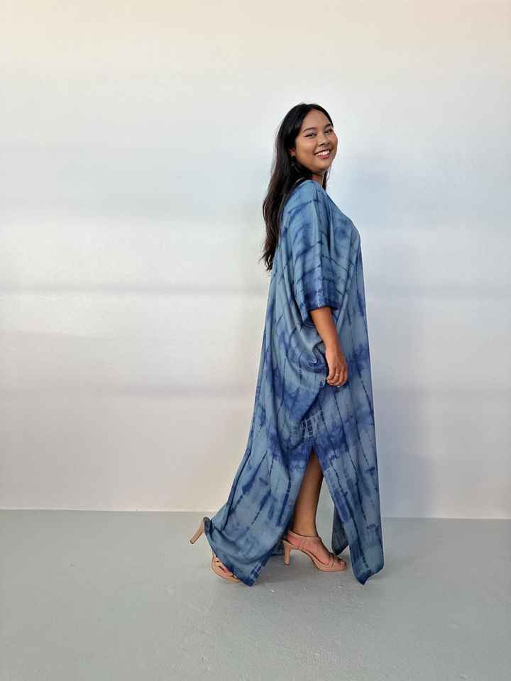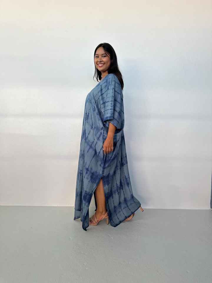 ชุดคาฟตันสีเทา-น้ำเงินลายมัดย้อม รุ่น CM 63 สำหรับผู้หญิง เหมาะสำหรับใส่ไปเที่ยวชายหาด รีสอร์ท ล่องเรือ ปาร์ตี้ริมสระน้ำ