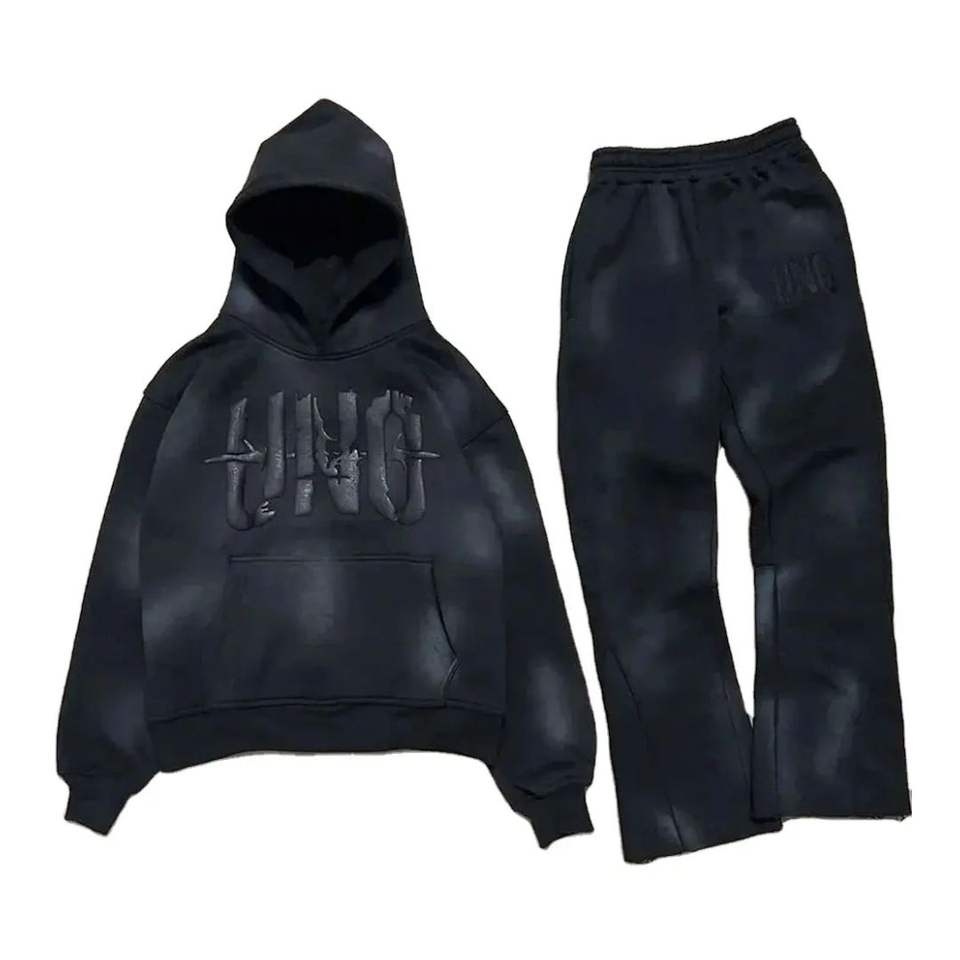 ชุดวอร์มกางเกงมีฮู้ดสองชิ้นสำหรับผู้ชายทรงหลวมโอเวอร์ไซส์ซักไหล่สีเทา