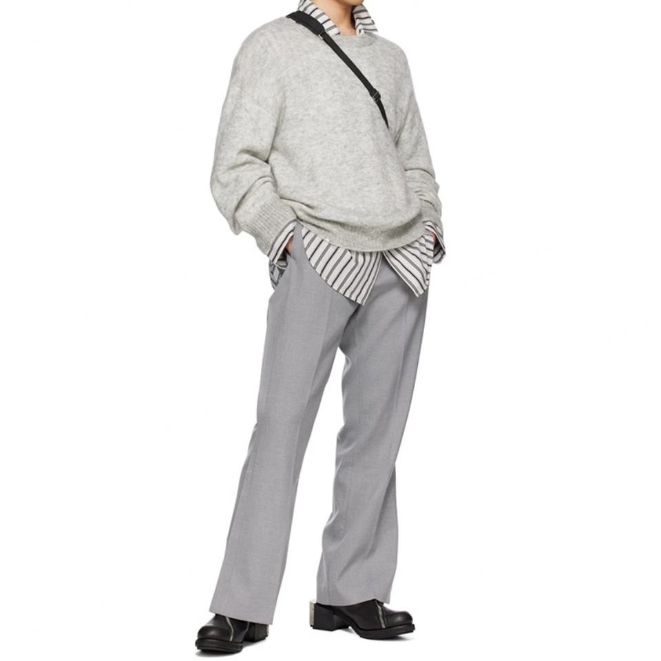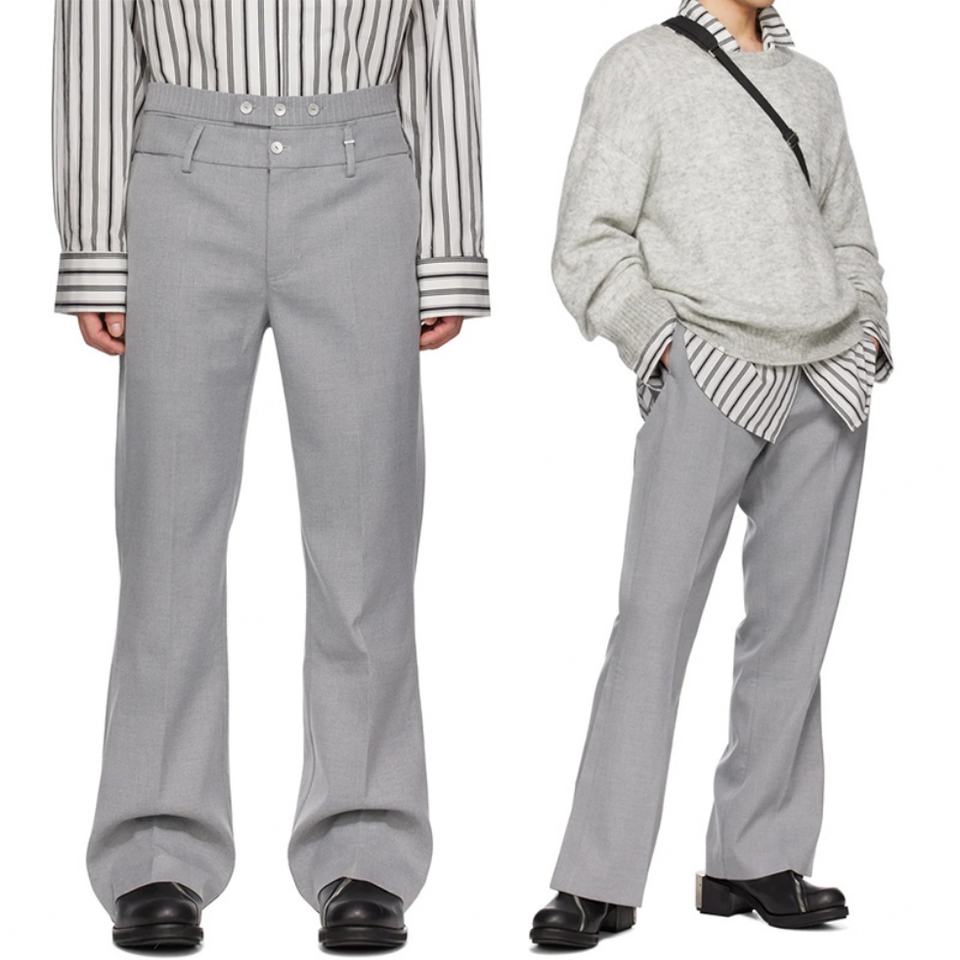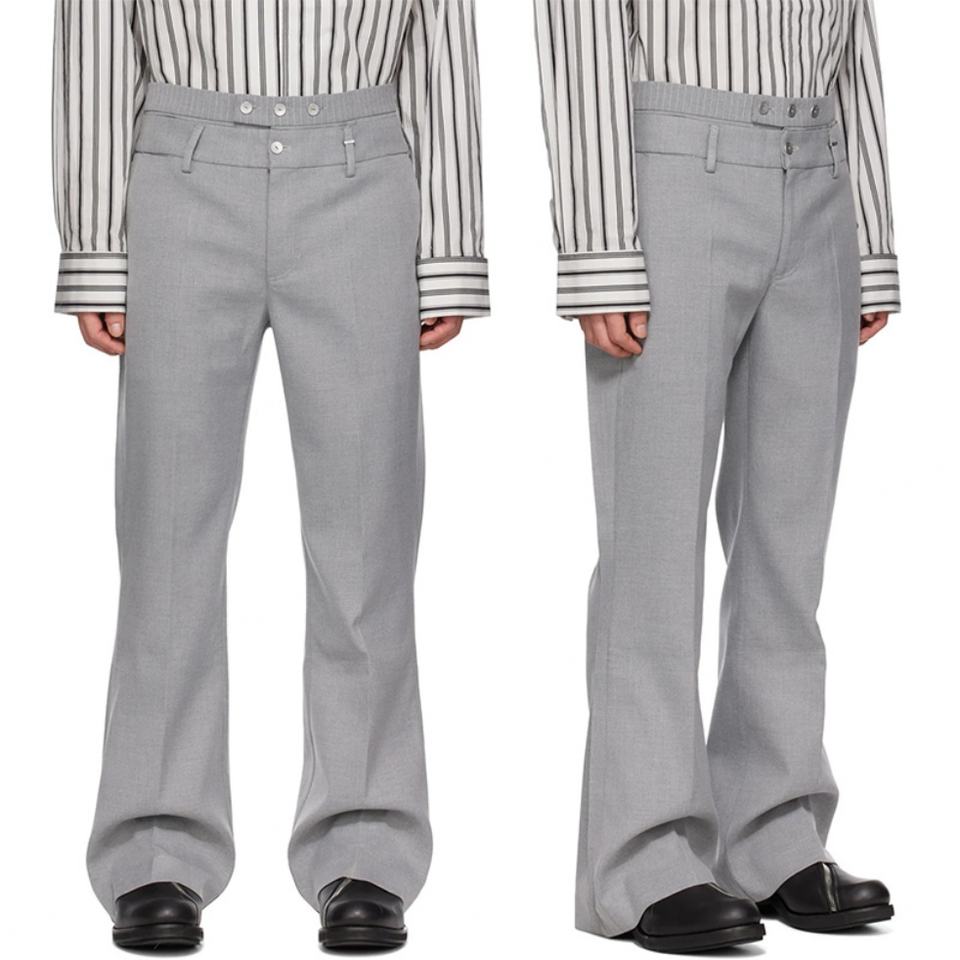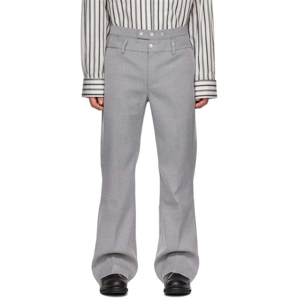 กางเกงขายาวทรงตรงผ้าแฟลนเนลสีเทาแต่งระบายช่วงเอวสำหรับผู้ชาย