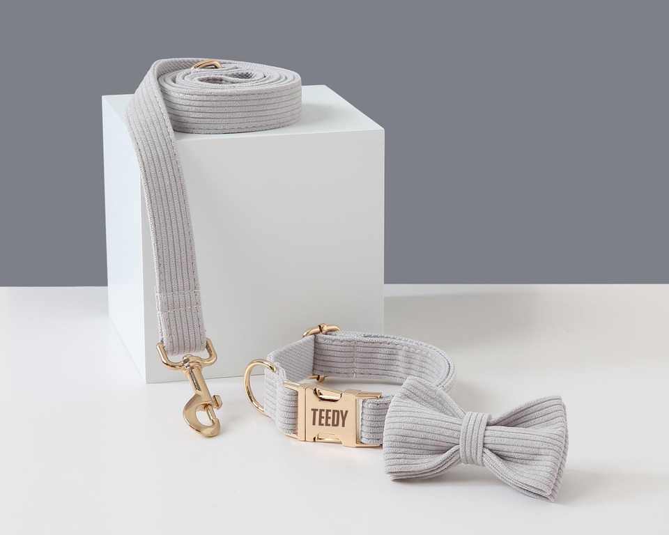 ชุดปลอกคอลูกสุนัขแบบกำหนดเองพร้อมชื่อของขวัญผูกโบว์สายสีเทา