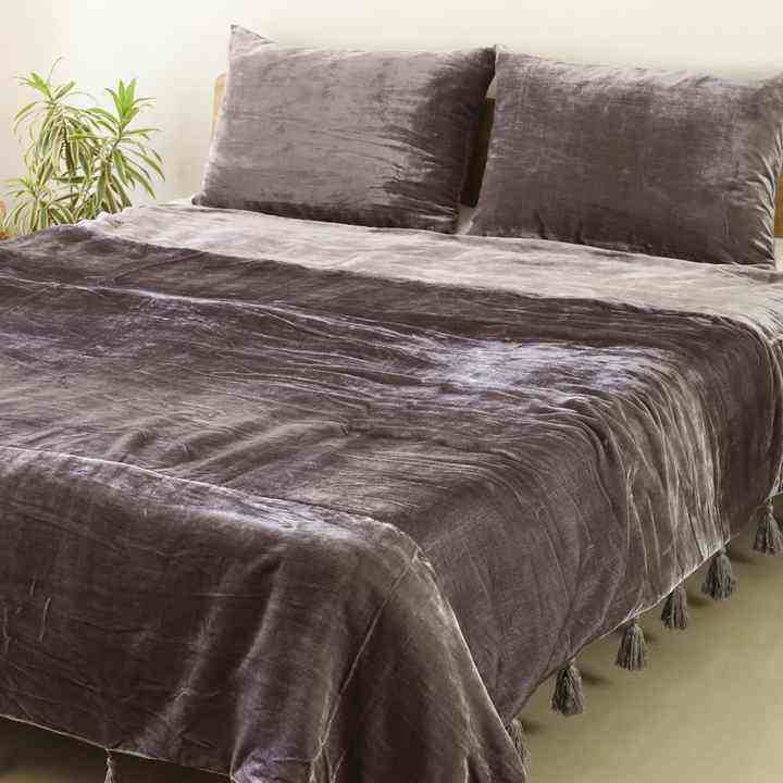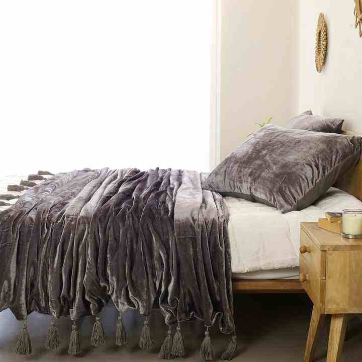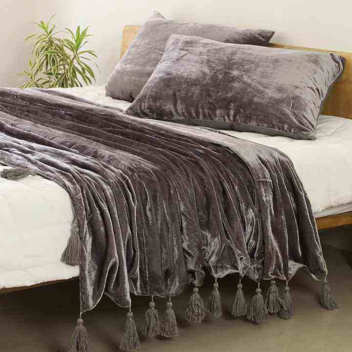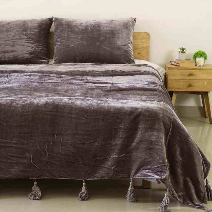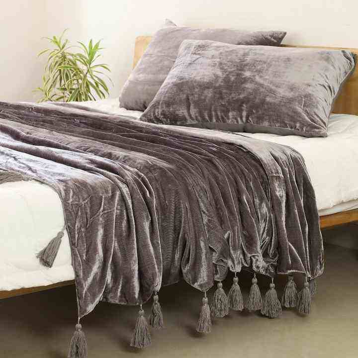 ผ้าคลุมเตียงและโซฟาผ้ากำมะหยี่สไตล์โบฮีเมียนหรูหราสีเทาผ้าห่มนุ่มสำหรับห้องนั่งเล่นในฤดูหนาวพร้อมพู่ถักด้วยมือ