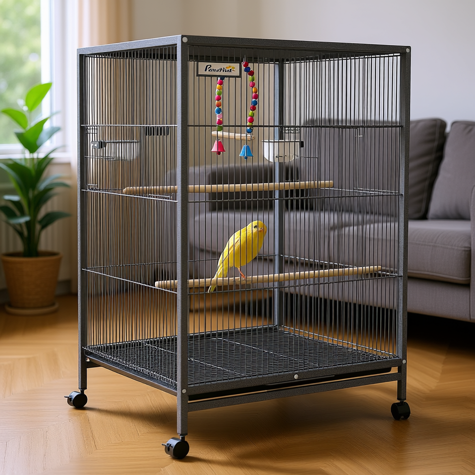 กรงนกโลหะ PawHut พร้อมขาตั้ง สำหรับนกแก้ว นกเลิฟเบิร์ด นกฟินช์ อุปกรณ์สัตว์เลี้ยงในบ้าน ทนทาน รูปทรงสี่เหลี่ยมผืนผ้า สีเทา