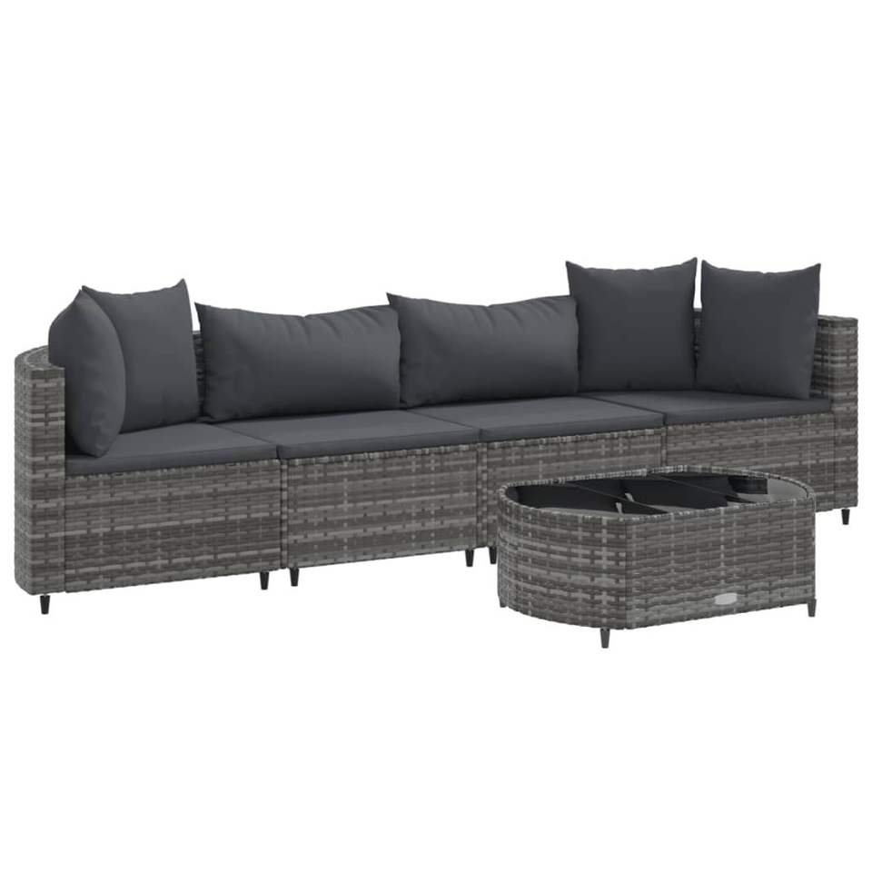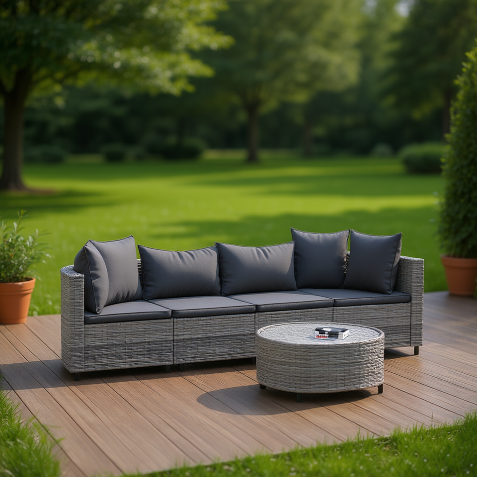 ชุดโซฟาหวายสีเทาสำหรับลานบ้าน ขาปรับระดับได้ โซฟาสำหรับสวนกลางแจ้ง ดีไซน์ร่วมสมัย เบาะโฟมความหนาแน่นสูง