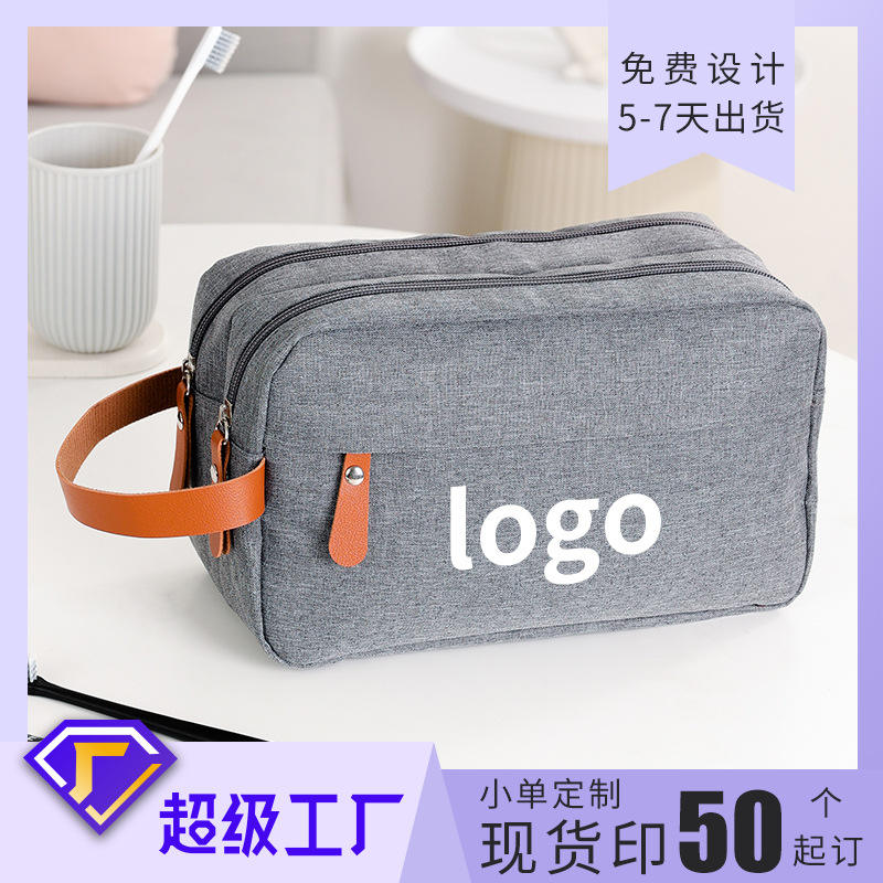 กระเป๋าใส่เครื่องสำอางทรงสี่เหลี่ยมสีเทาสำหรับผู้ชาย สำหรับเดินทาง กันความชื้น ช่องเก็บของสองชั้น พร้อมหูหิ้วหนัง