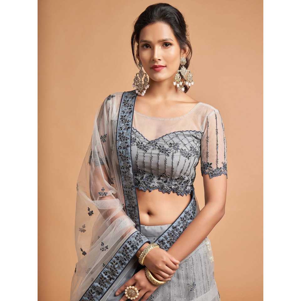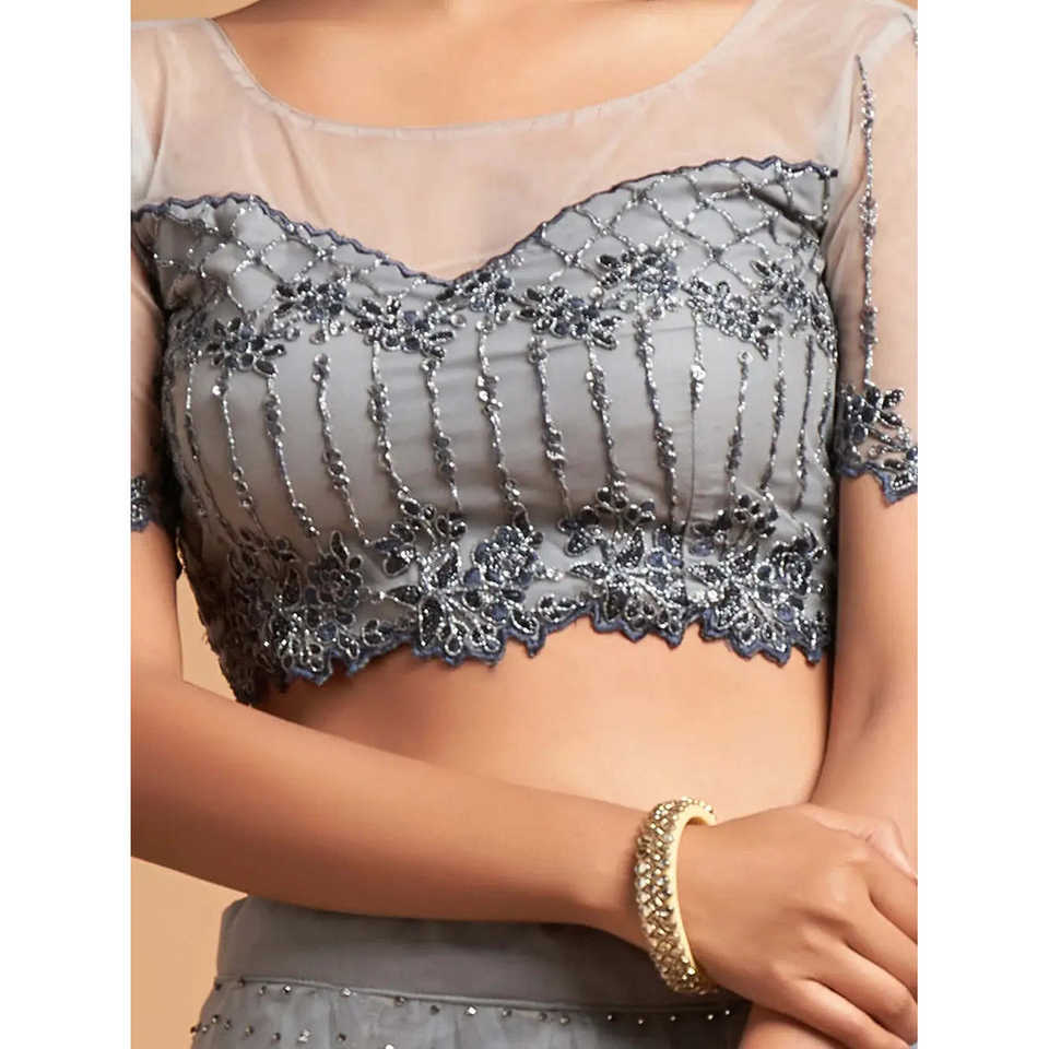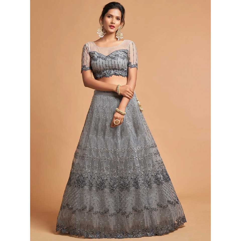 ชุดราตรีผ้าตาข่ายปักลายซารีสีเทาเข้ม สำหรับงานเลี้ยง ชุดเลเฮนกาโชลี