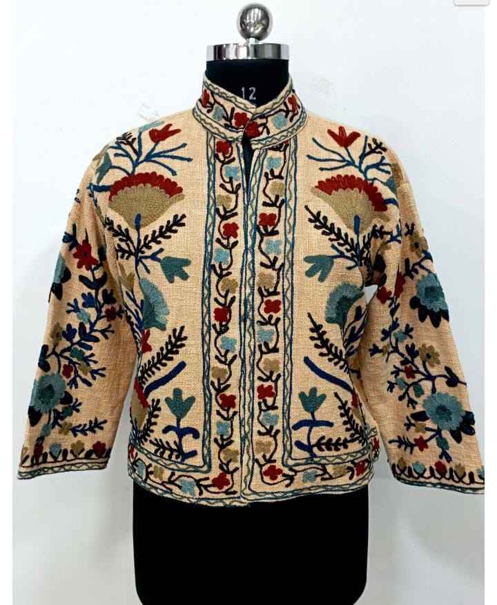 เสื้อโค้ทโบโฮยูนิเซ็กส์สไตล์อินเดียใส่ได้ทั้งชายและหญิงเสื้อเบลเซอร์วินเทจลายดอกไม้สำหรับฤดูใบไม้ร่วงแจ็คเก็ตปักคอตตอนซูซานี่ทำมือ