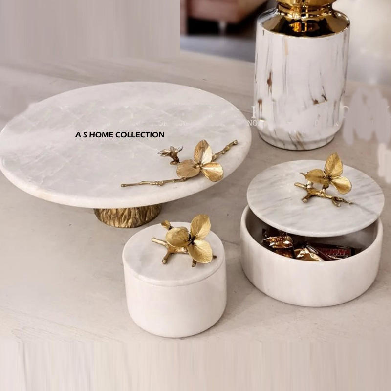 ชามเสิร์ฟดีไซน์ใบไม้สีทองทรงกลมหินอ่อนสีขาวคุณภาพเยี่ยมสำหรับใช้ในครัวเรือน