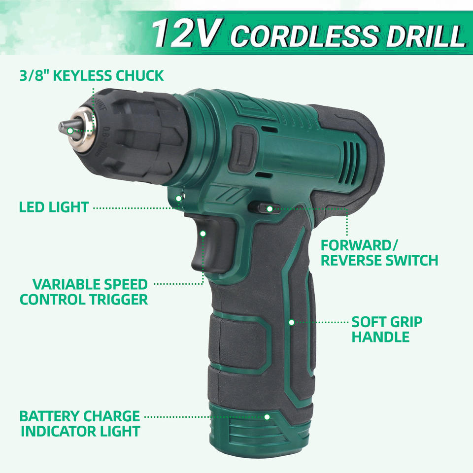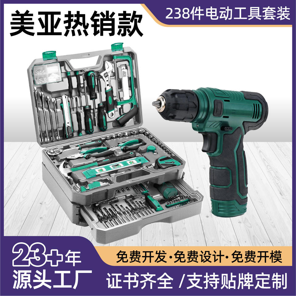 ชุดเครื่องมือสีเขียว 238 ชิ้น พร้อมสว่านไฟฟ้า 12V ชุดซ่อมแซมในบ้าน ใช้แบตเตอรี่ ชุดเครื่องมือเหล็กสำหรับการบำรุงรักษาบ้าน