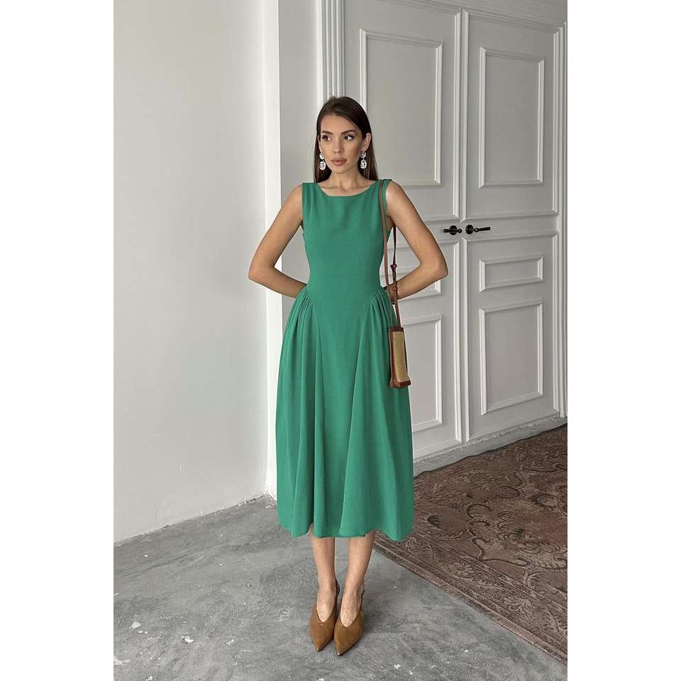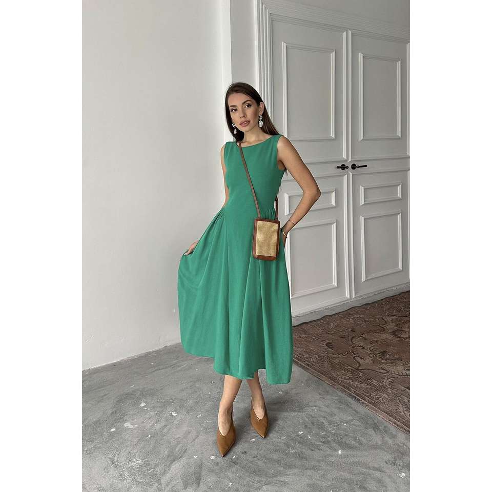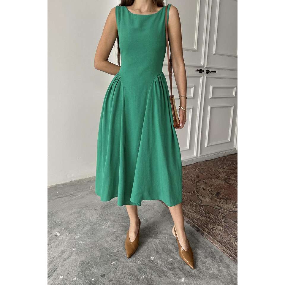 เดรสทรงเอไลน์สีเขียว ความยาวปานกลาง สายเดี่ยว ผ้าทอ เอวธรรมชาติ ระบายอากาศได้ดี สวมใส่สบายๆ ในชีวิตประจำวัน