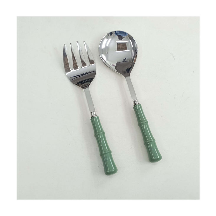 ชุดเสริฟสลัดด้ามไม้ไผ่สีเขียวช้อนเสิร์ฟสลัดทำจากสแตนเลสคุณภาพดีเยี่ยม
