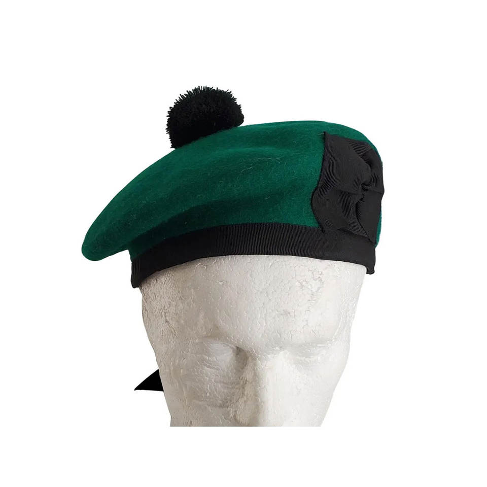 หมวกบัลมอราลสีเขียวดำเรียบ หมวกบัลมอราลขนสัตว์แบบดั้งเดิม หมวกไพเพอร์ขายส่ง หมวกสก็อตแลนด์