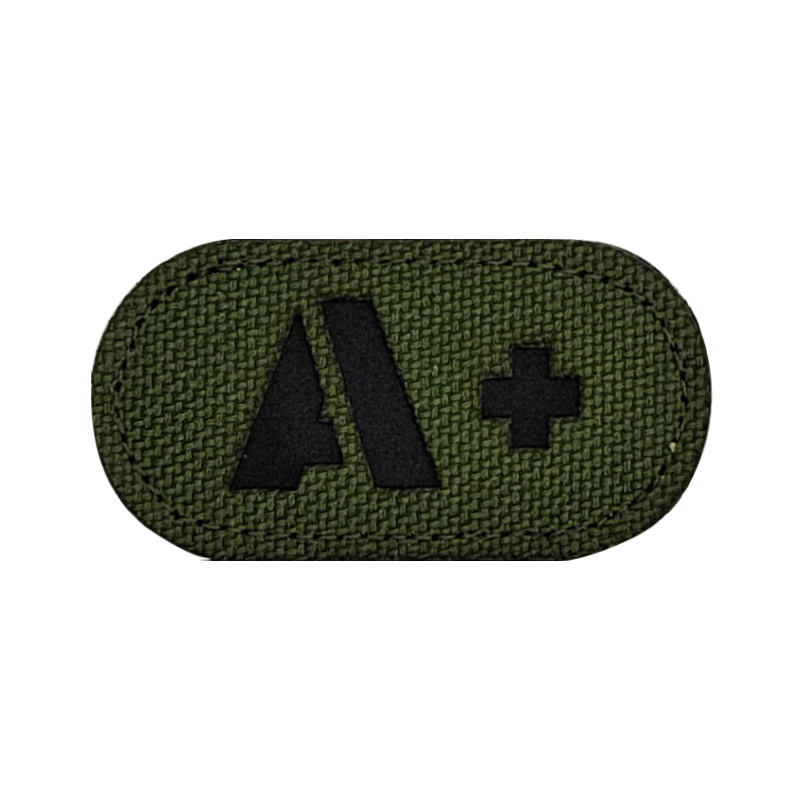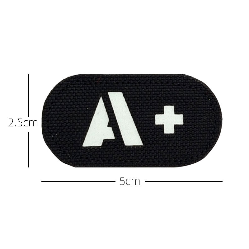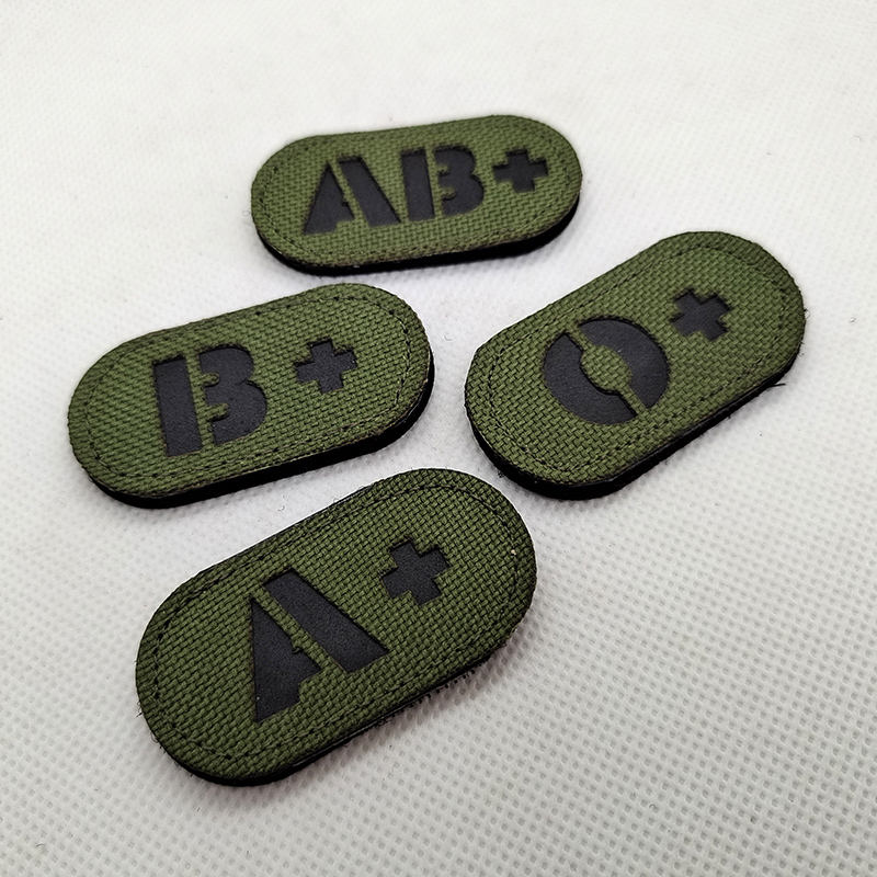 แผ่นป้ายแสดงหมู่เลือดสีเขียวดำสะท้อนแสง ผลิตจากผ้ารีไซเคิล เป็นมิตรกับสิ่งแวดล้อม สำหรับชุดปฐมพยาบาล พร้อมแถบตีนตุ๊กแก ขนาด 5*2.5 ซม.