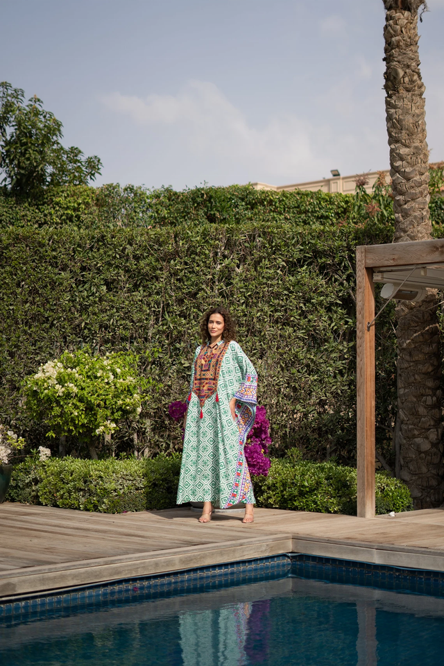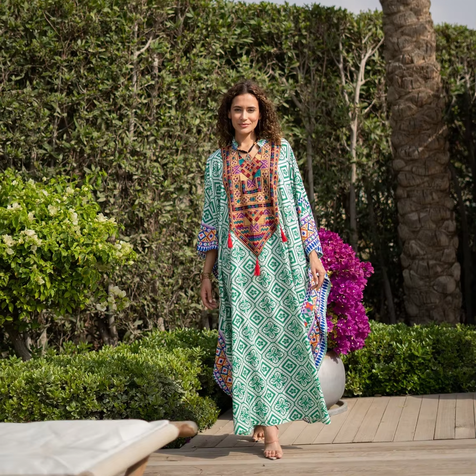 ชุดคาฟตันสำหรับผู้หญิงพิมพ์ลายโบโฮสีเขียวสำหรับฤดูร้อนขนาดใหญ่พิเศษปักลาย