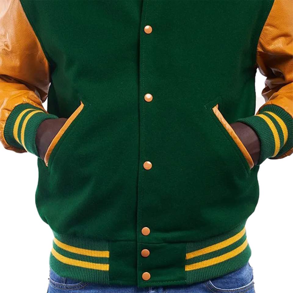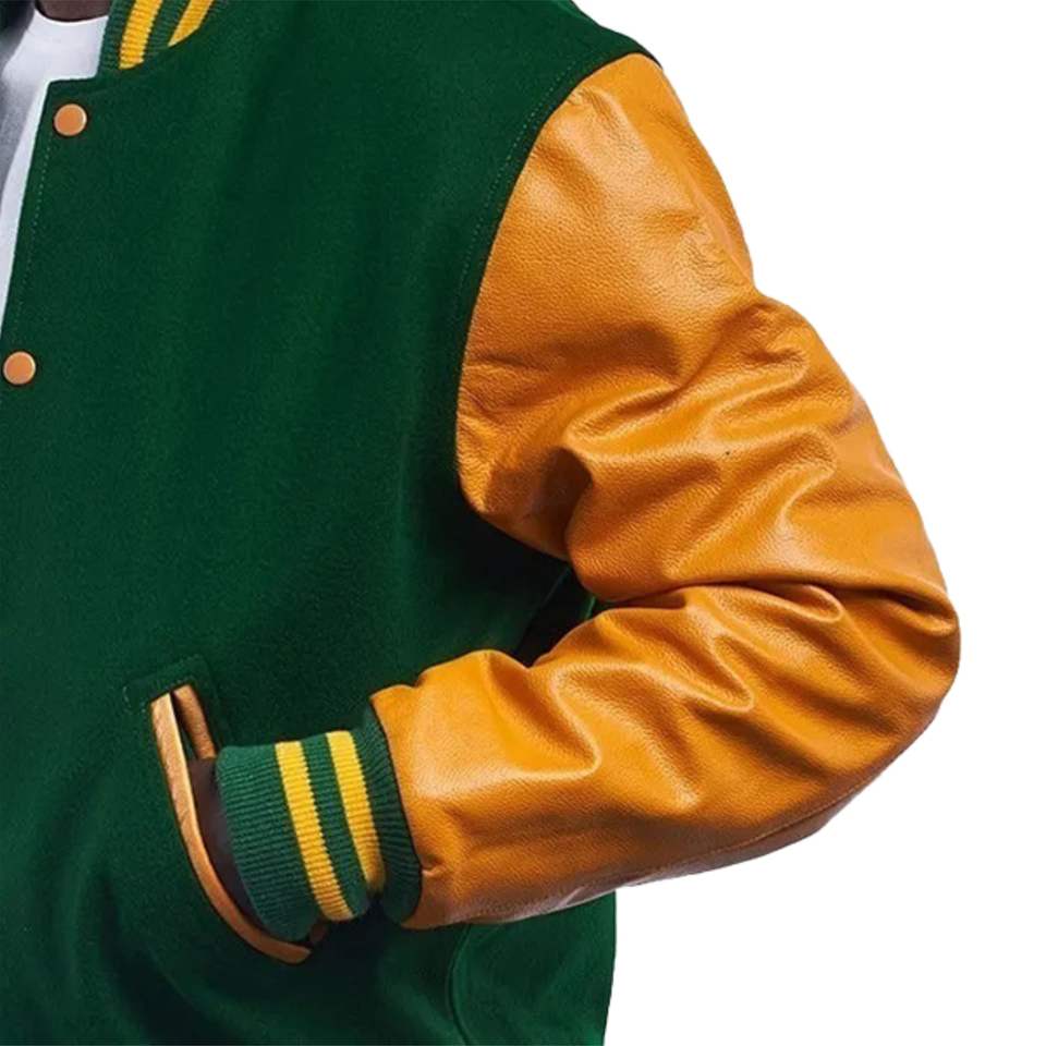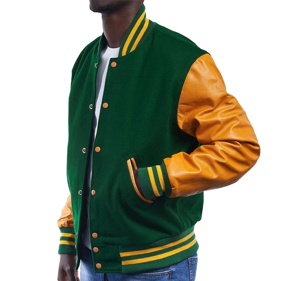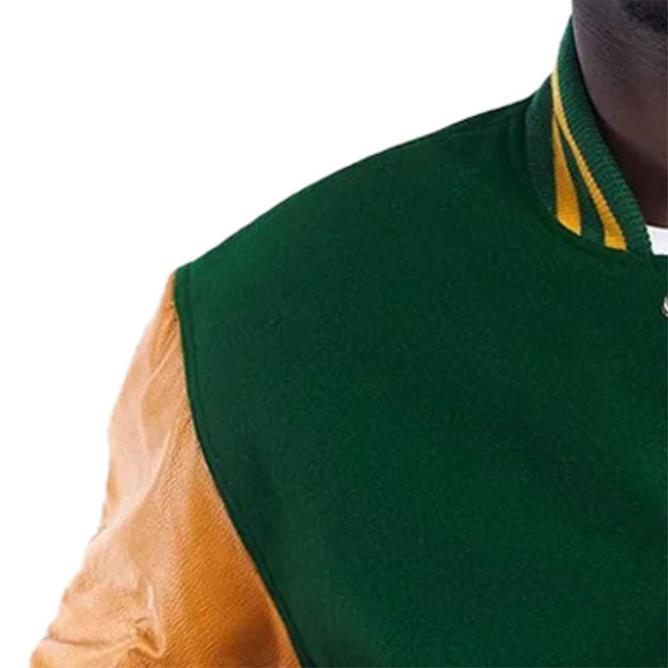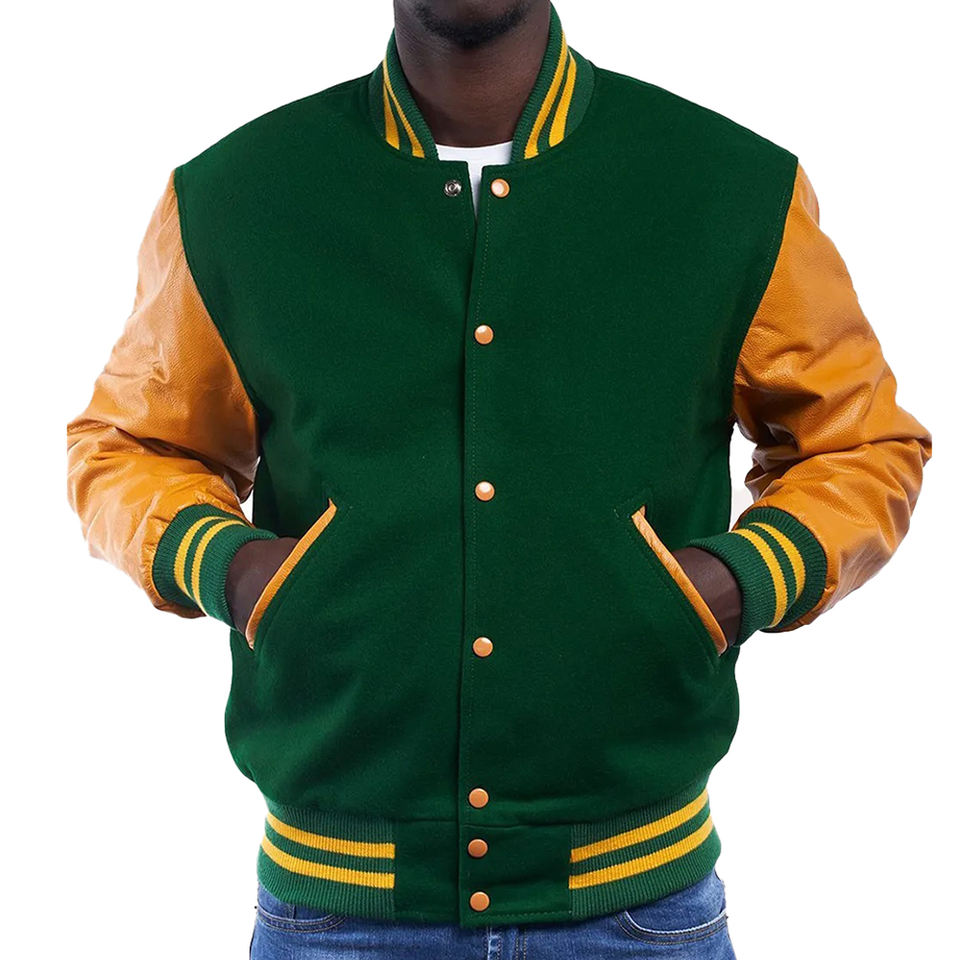 แจ็คเก็ตเบสบอลบอมเบอร์สีเขียวสำหรับทุกเพศเสื้อแจ็กเก็ตทีมเบสบอลแขนหนังสีและโลโก้แบบกำหนดเอง