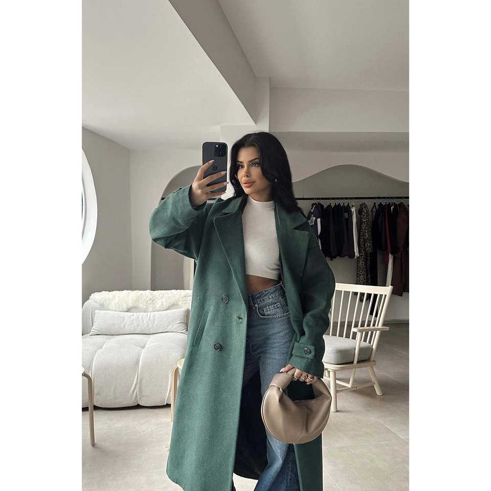 เสื้อโค้ทผู้หญิงสีเขียว แต่งกระดุมด้านหน้าและกระเป๋า