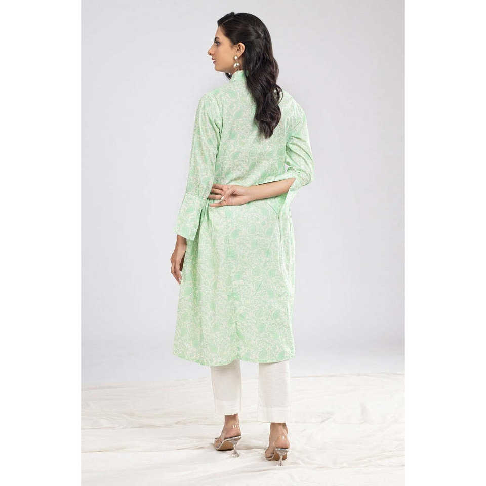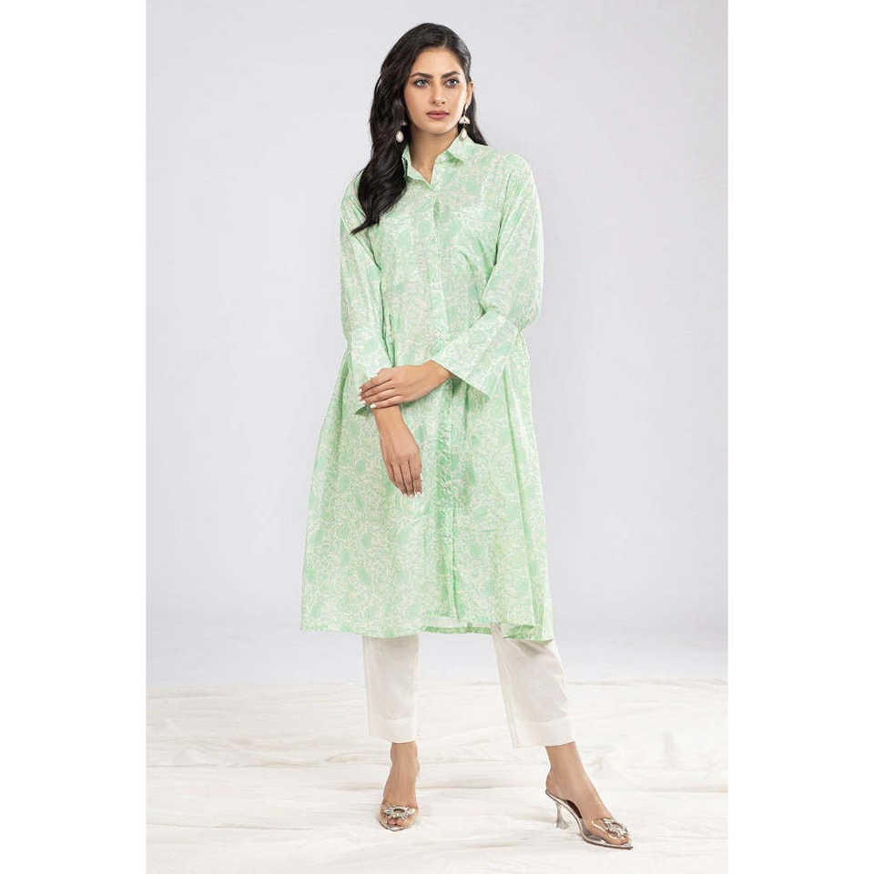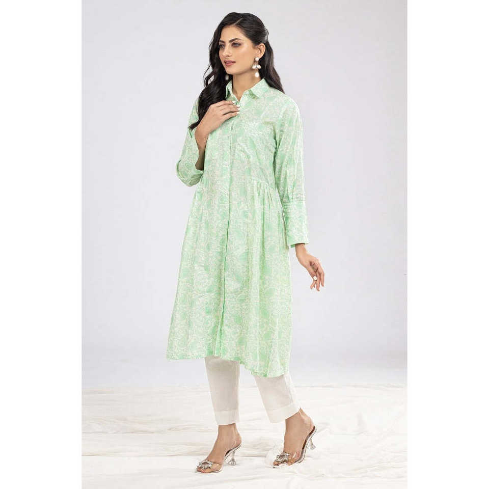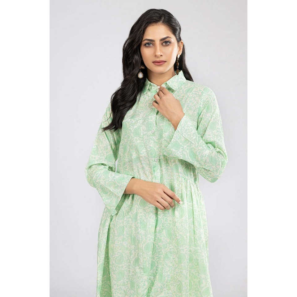 Green Cambric Printed Poplin Shirt for Women Free Size XL Casual Western Style Button Decoration Long for Autumn Spring Summer