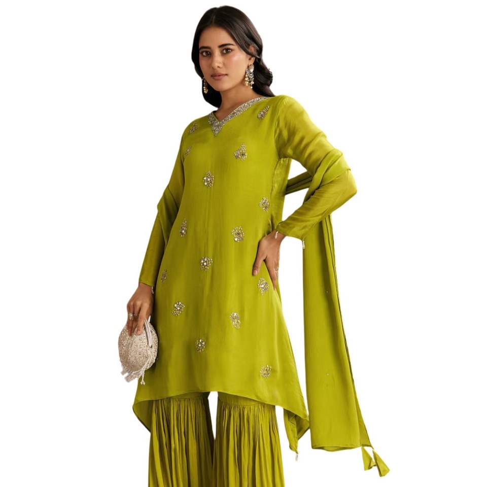 ชุดบิกินีสีเขียวไม่สมมาตร Kurta Sharara กับ Dupatta ออกแบบที่ไม่ซ้ำกันชุดปาร์ตี้ชาติพันธุ์สำหรับงานแต่งงาน