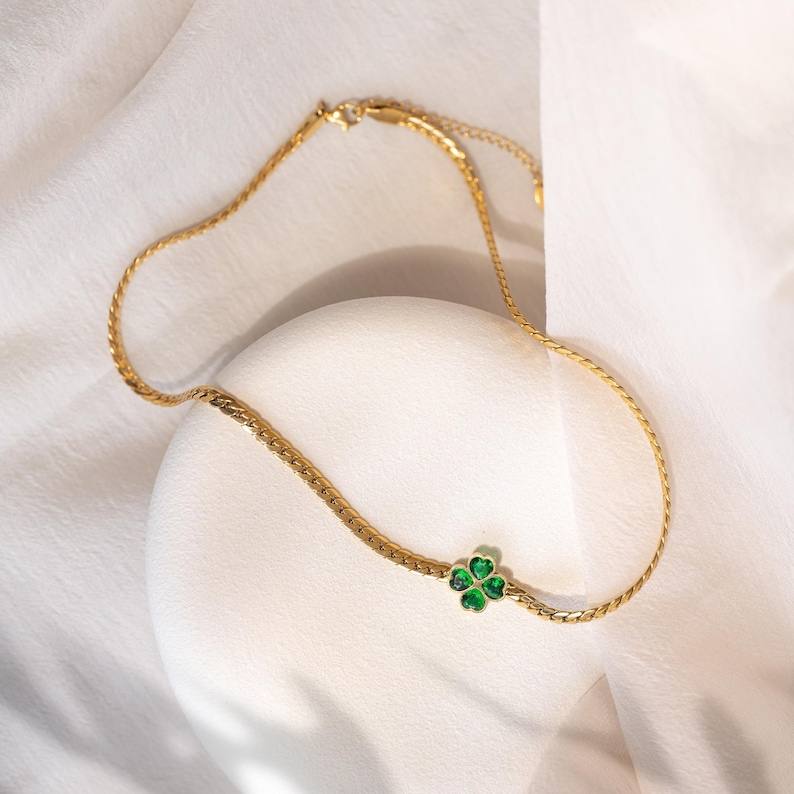 สร้อยข้อมือเงินแท้ 925 ชุบทอง 14K รูปใบโคลเวอร์สีเขียว สร้อยคอทองคำ กันน้ำ เคลือบ PVD ของขวัญวันเกิดสำหรับเธอ