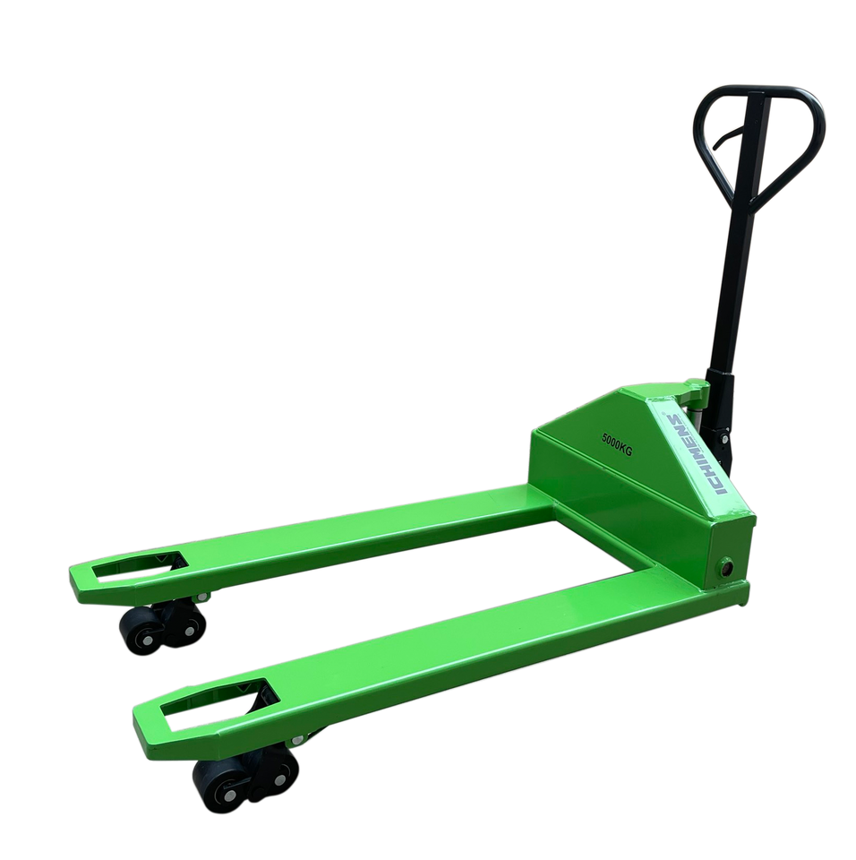 รถยกพาเลทไฮดรอลิกสีเขียว ขนาด 680x1150 มม. รับน้ำหนัก 5.0 ตัน ล้อ PU/PU แบบ Tandem สำหรับใช้งานภายใน/ภายนอกอาคาร