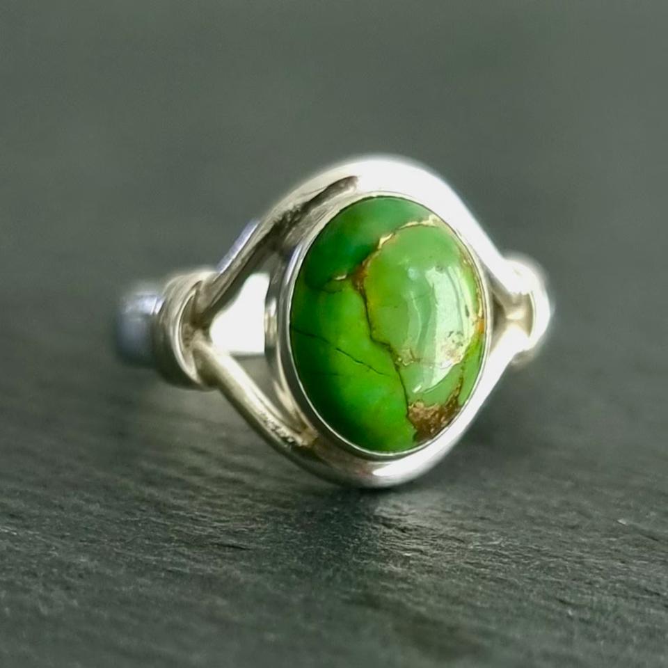 แหวนทำมือสีเขียวทองแดงเทอร์ควอยส์925เงินแท้แหวนอัญมณีธรรมชาติ