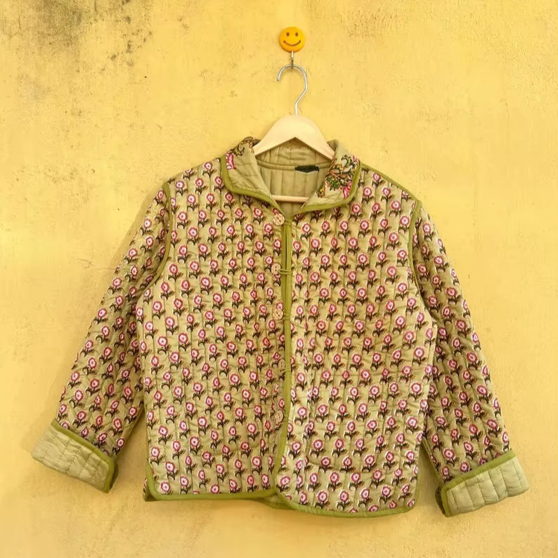 เสื้อแจ็คเก็ตผ้าฝ้ายสีเขียวแบบควิลท์สำหรับผู้หญิง แจ็คเก็ตแฟชั่นแบบกลับด้านได้ ลายดอกไม้ แจ็คเก็ตสำหรับผู้หญิงและเด็กผู้หญิง แจ็คเก็ตฤดูหนาวและฤดูร้อน สไตล์โบฮีเมียน แจ็คเก็ตตัวยาวและตัวสั้น