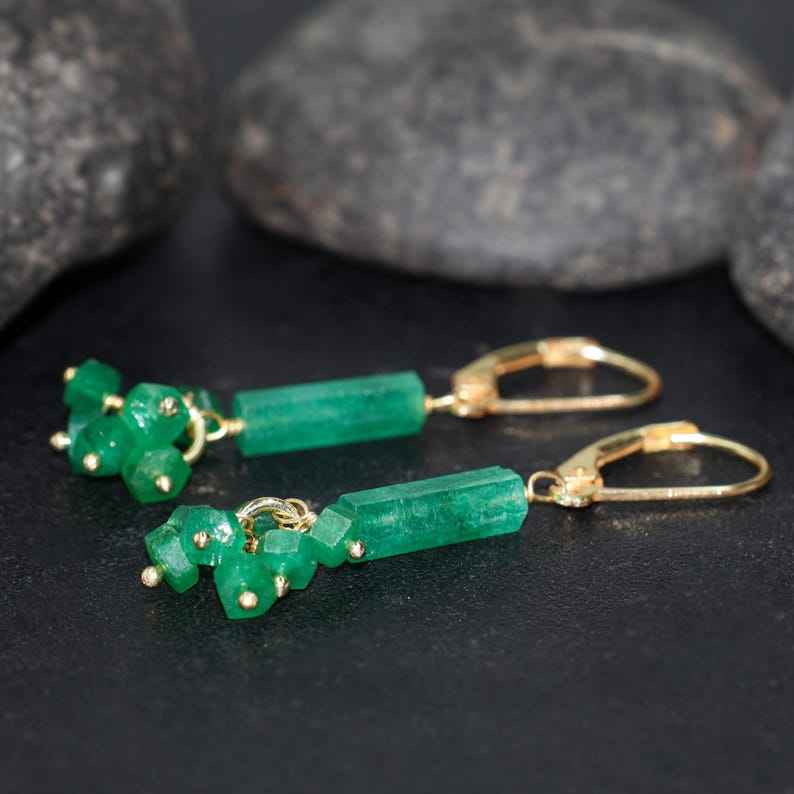 ต่างหูห้อยลูกปัดสีเขียวมรกตสำหรับผู้หญิงต่างหูทรงพลอยทรงหกเหลี่ยมทำด้วยมือเป็นของขวัญสำหรับเธอ