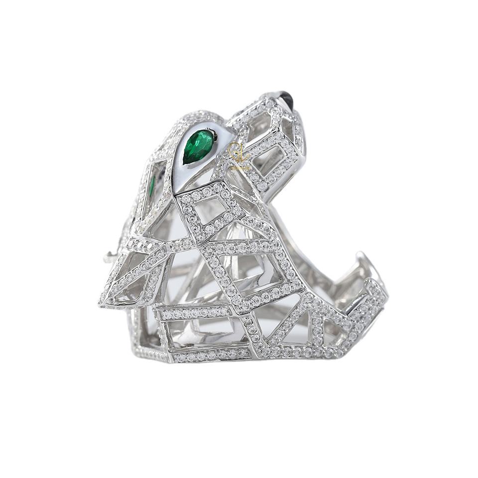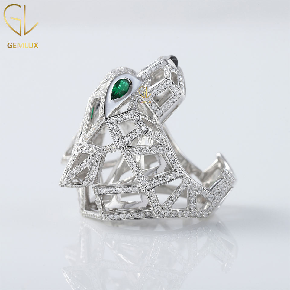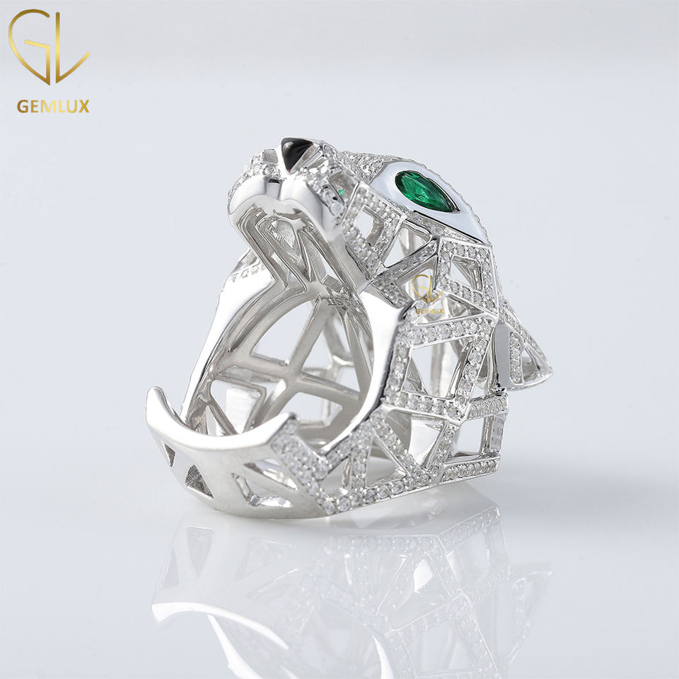 แหวนตาสีเขียวมรกต Iced Out D VVS Moissanite แหวนสัตว์เสือแพนเธอร์, แหวนแรงบันดาลใจจากสัตว์, แหวนฮิปฮอปเสือแพนเธอร์ทองคําแข็ง 14k