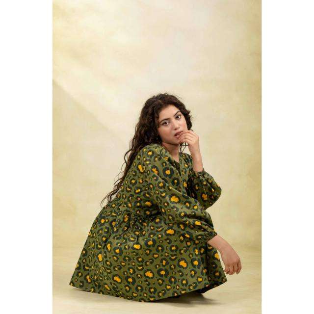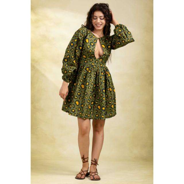 เดรสสั้นสีเขียวลายดอกไม้ ตัดเย็บแบบเว้าช่วงเอว ทรงเอไลน์ แขนพองยาว คอรูรูปหยดน้ำ ผ้าฝ้าย 100% เอวเข้ารูป