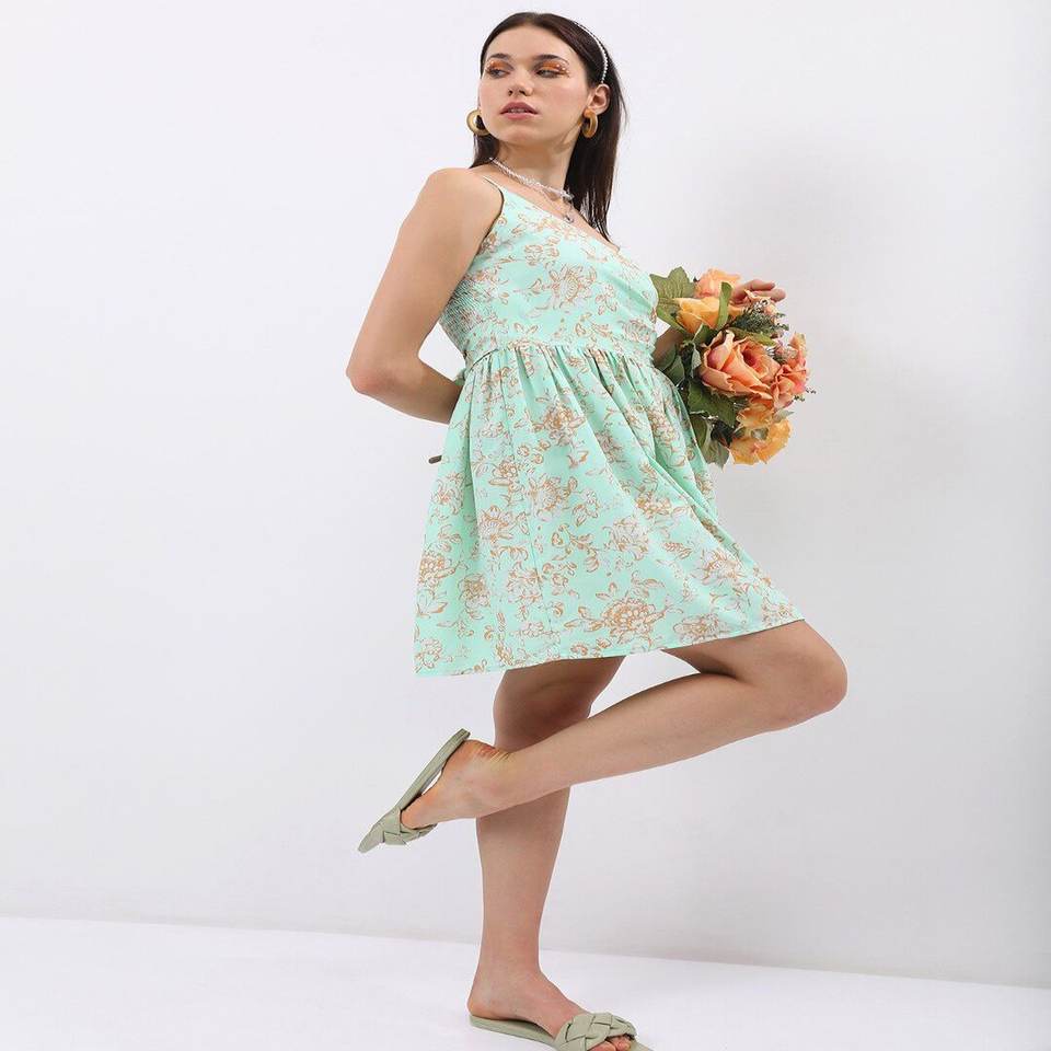 ชุดเดรสผู้หญิงแขนกุดระบายอากาศน้ำหนักเบาพิมพ์ลายดอกไม้สีเขียวสามารถเลือกสีได้หลายสี