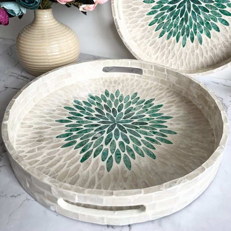ถาดเสิร์ฟไม้ลายดอกไม้สีเขียวตกแต่งด้วยโมเสคแก้วและมุกสำหรับห้องครัว โต๊ะทำงาน ห้องนั่งเล่น