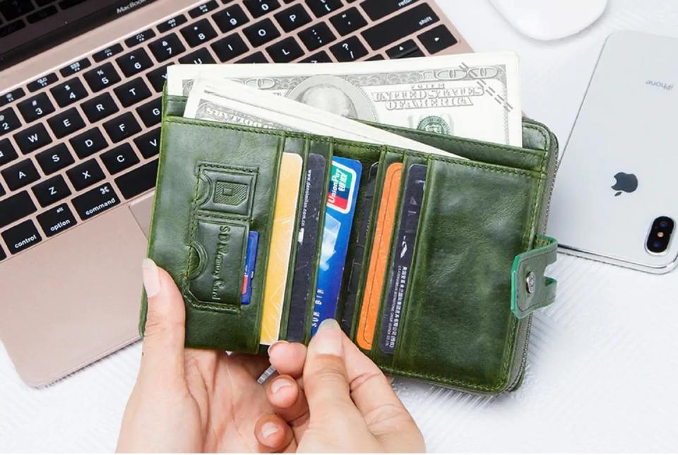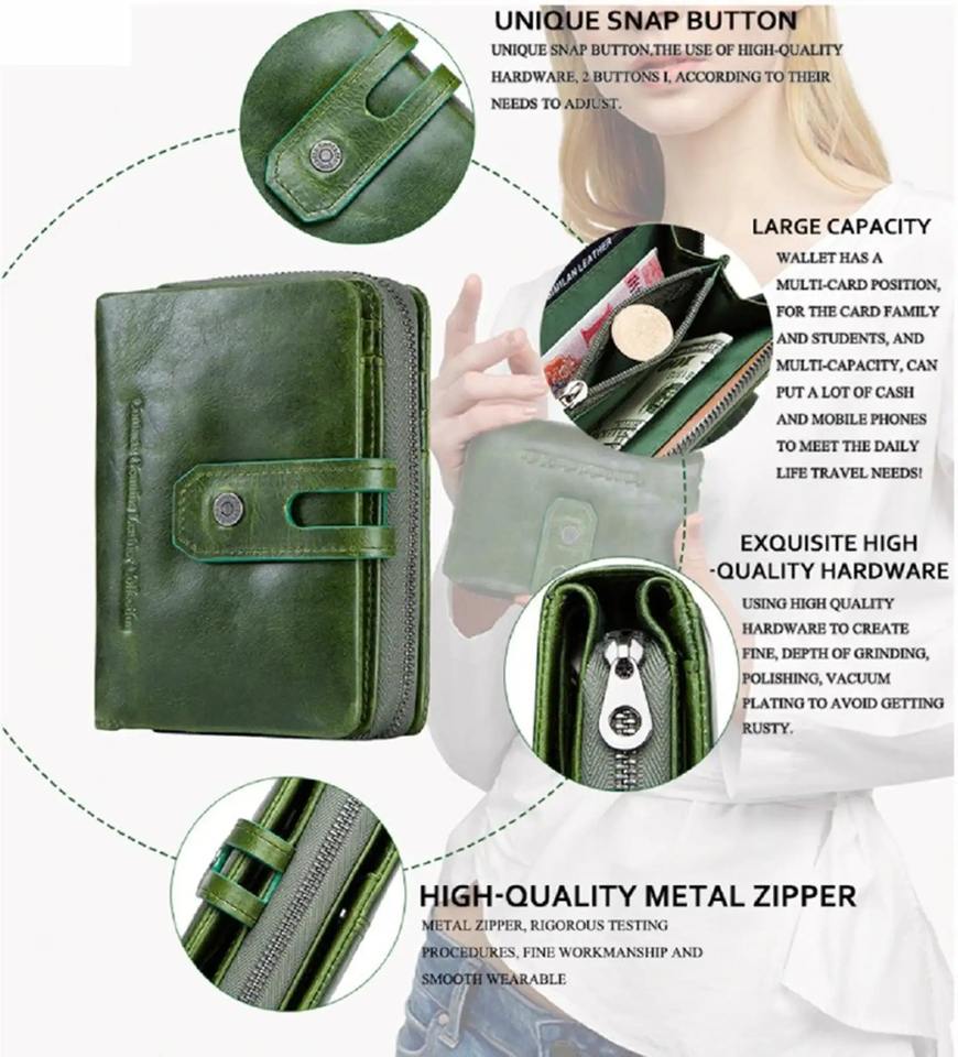กระเป๋าสตางค์หนังแท้สีเขียวรักษ์โลกสำหรับผู้หญิง ป้องกัน RFID พร้อมช่องใส่บัตร ช่องใส่เหรียญแบบซิป กระเป๋าแบบพับสองตอน ขนาดเล็ก