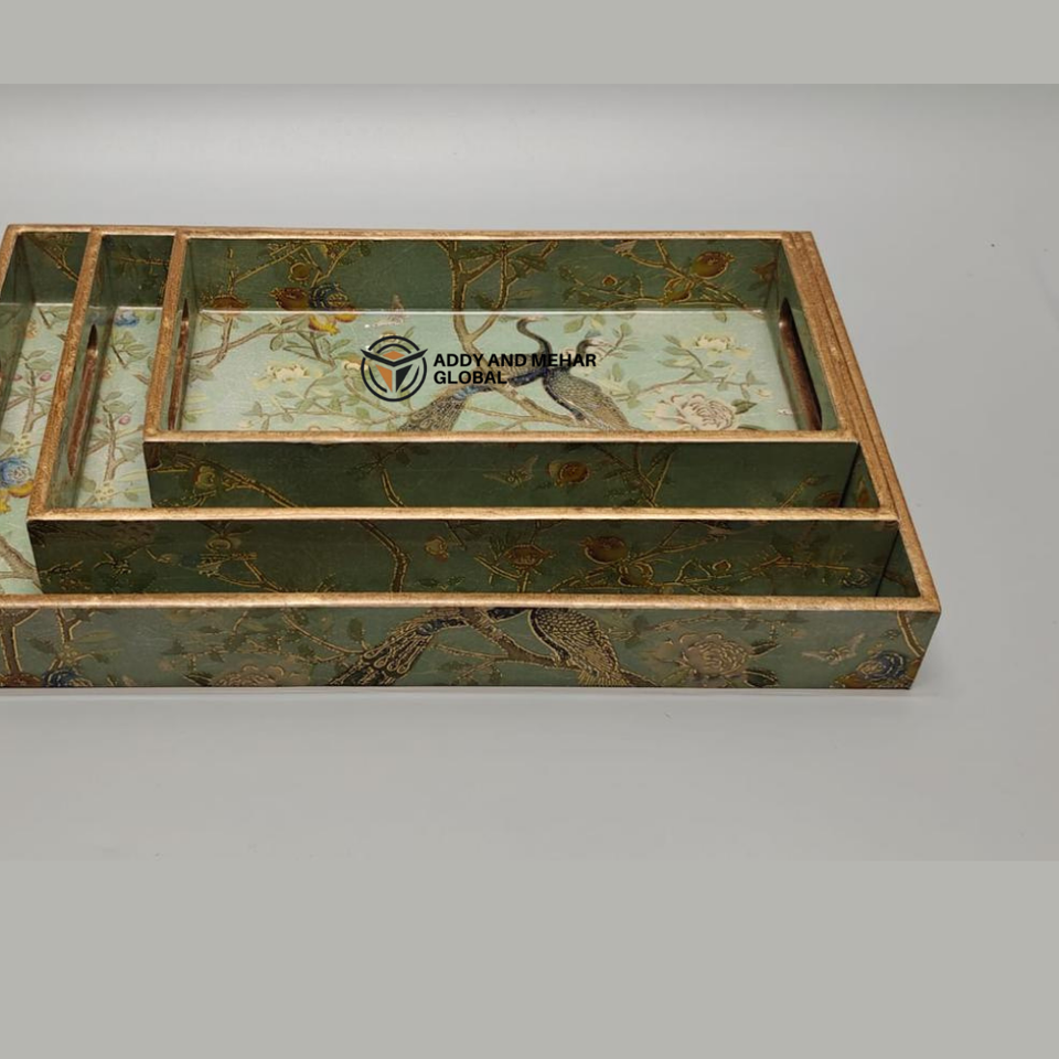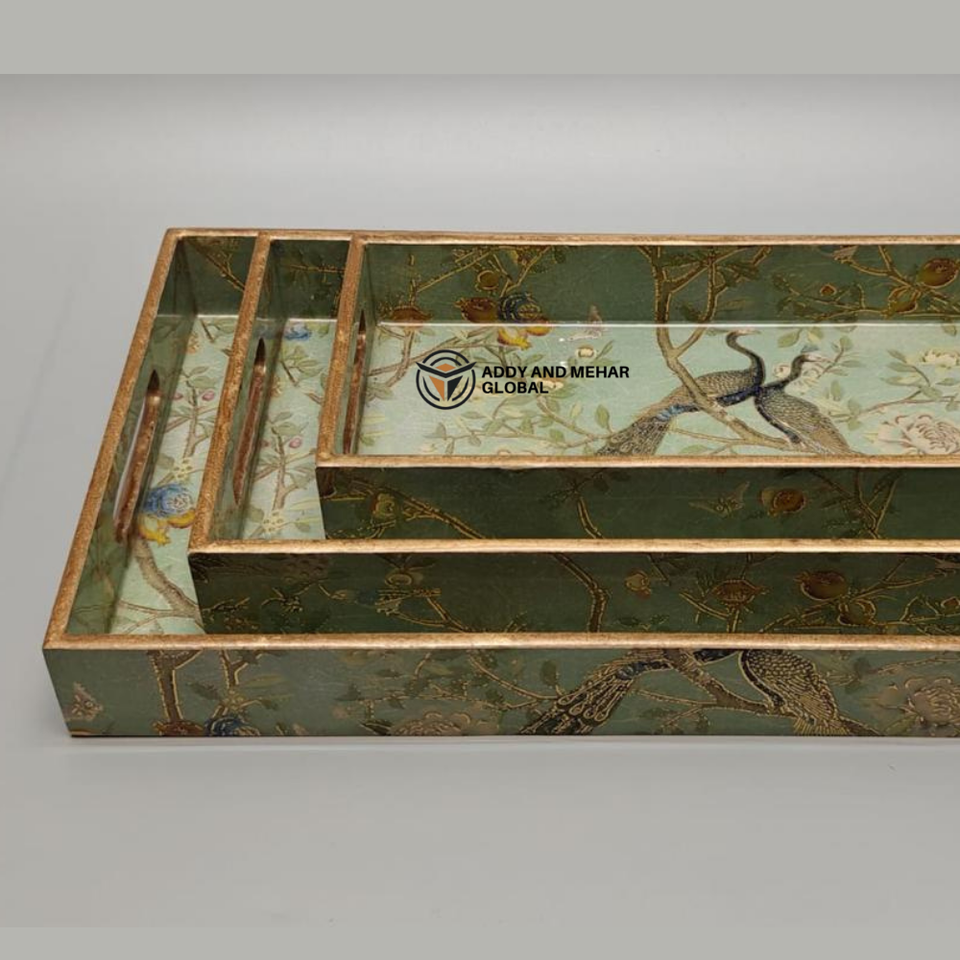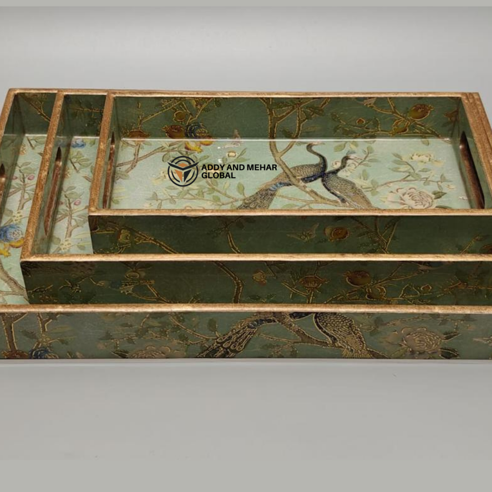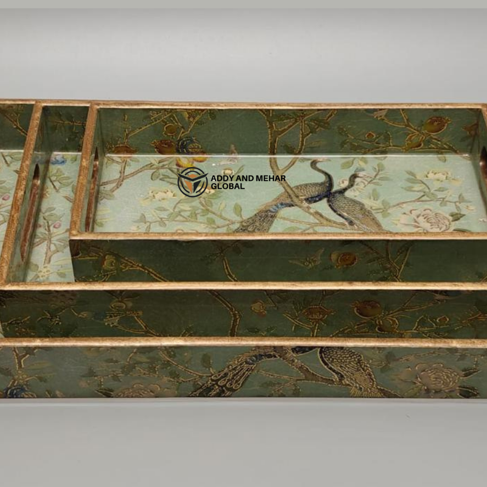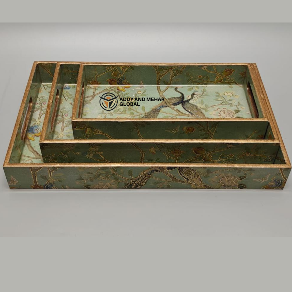 ชุดถาดเสิร์ฟเคลือบสีเขียวลายเรขาคณิต 3 ชิ้น – ถาดซ้อนกันได้ทำจาก MDF และกระดาษ ปลอดภัยสำหรับอาหาร ดีไซน์ทันสมัยหรูหรา สำหรับห้องครัว ห้องรับประทานอาหาร และตกแต่งบ้าน