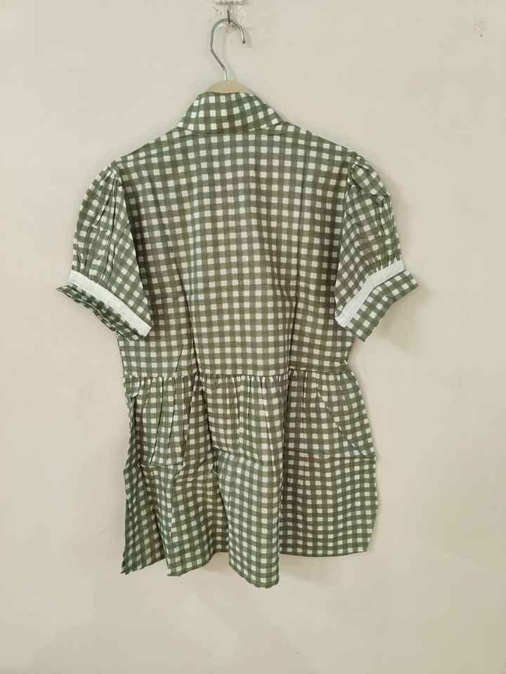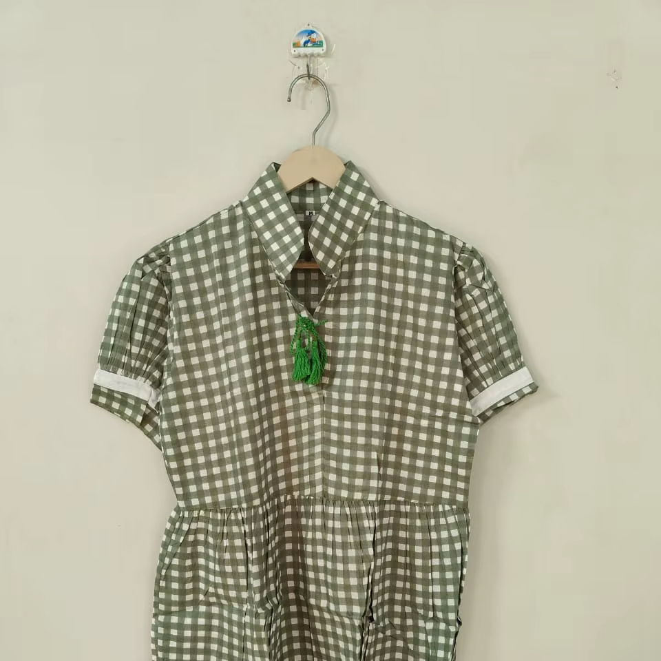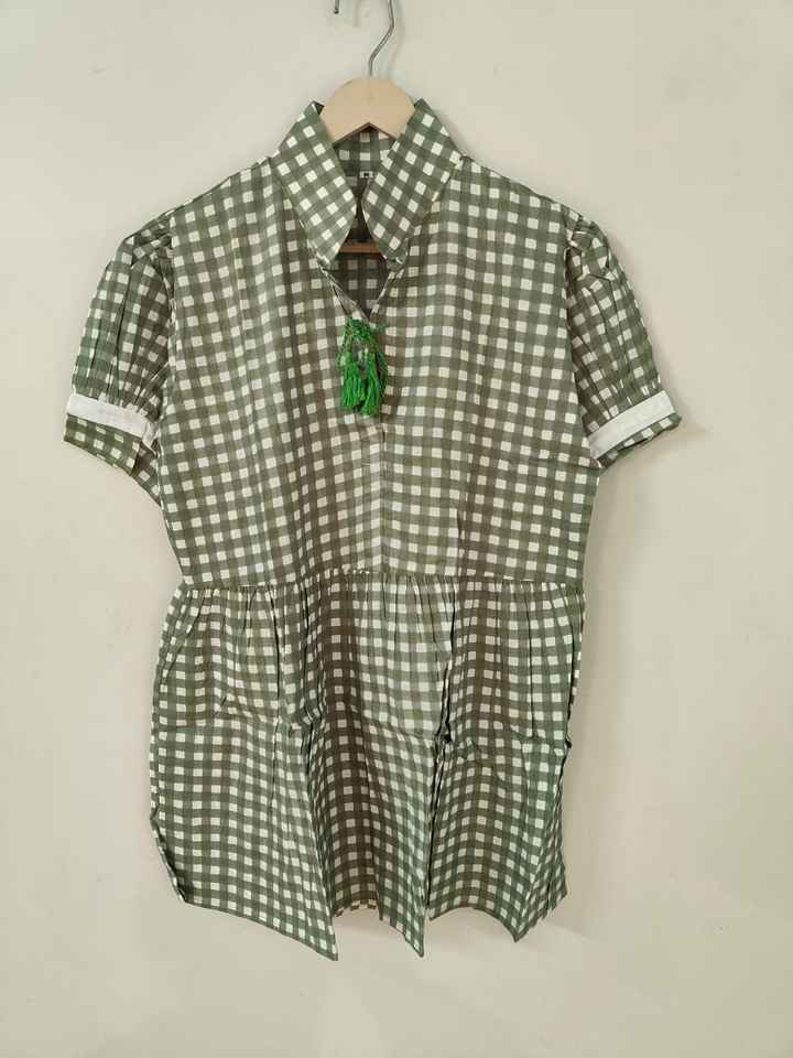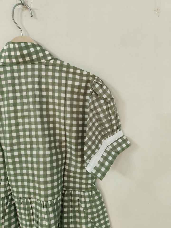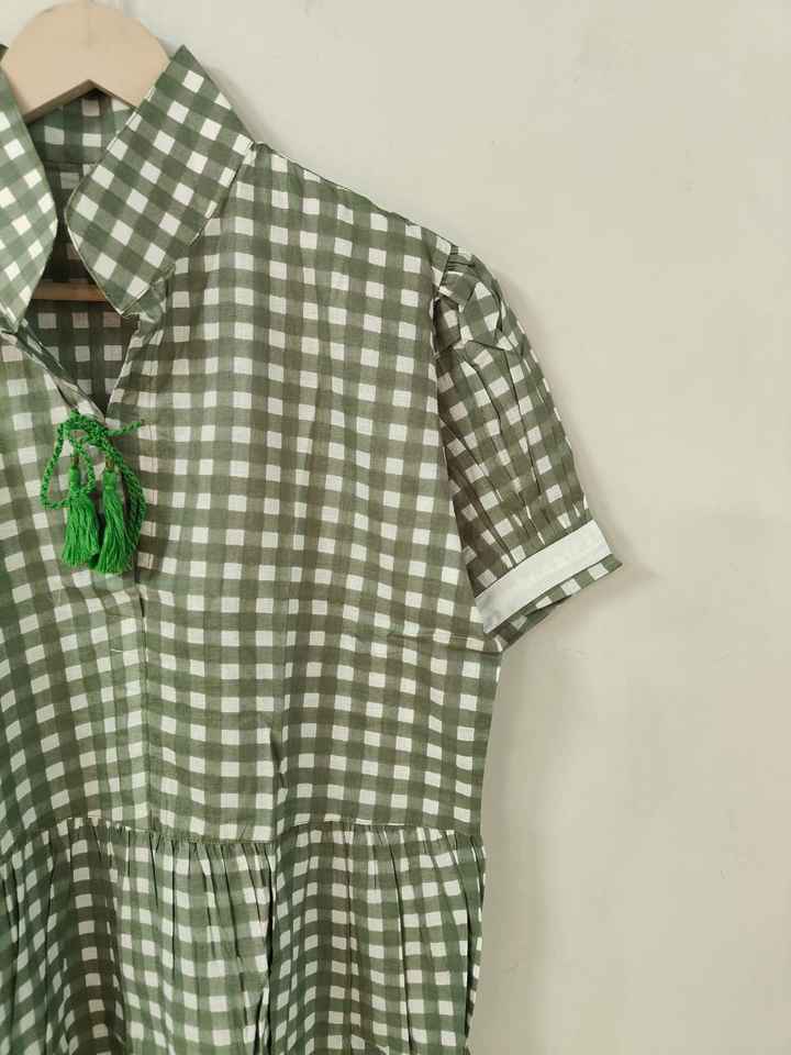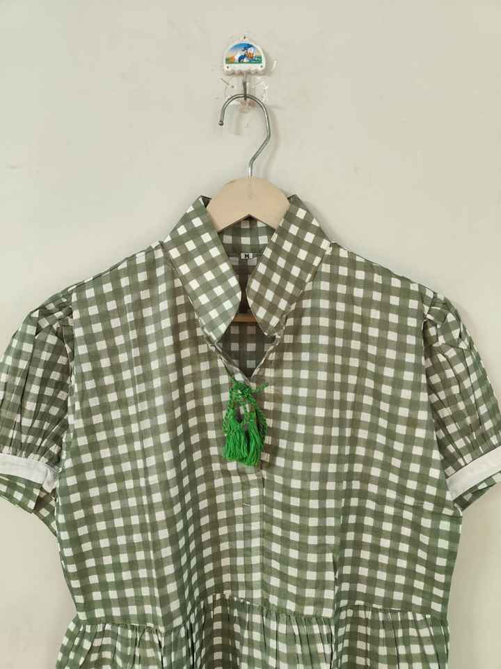 ชุดเดรสผ้าฝ้ายลายตารางสีเขียวสำหรับผู้หญิง แฮนด์เมด แขนสั้น คอปก ชุดมินิเดรสฤดูร้อน สไตล์โบโฮ เสื้อเชิ้ตทูนิคลำลอง