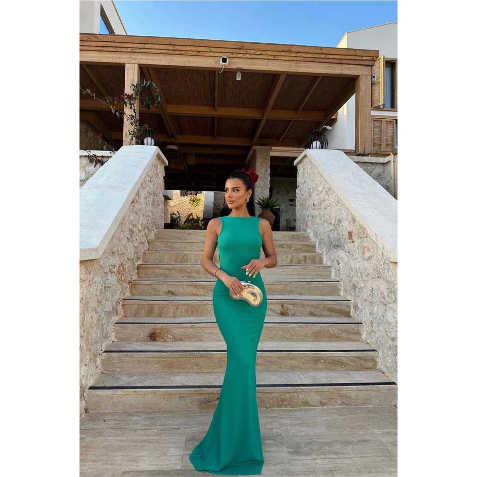 ชุดราตรีหรูหราสีเขียวสดใส ดีไซน์เก๋ไก๋ ประดับกลิตเตอร์ด้านหลัง ทรงบอลกาวน์ ทรงเอไลน์ ยาวลากพื้น ประดับเลื่อม ไข่มุก และดอกไม้ สำหรับงานปาร์ตี้